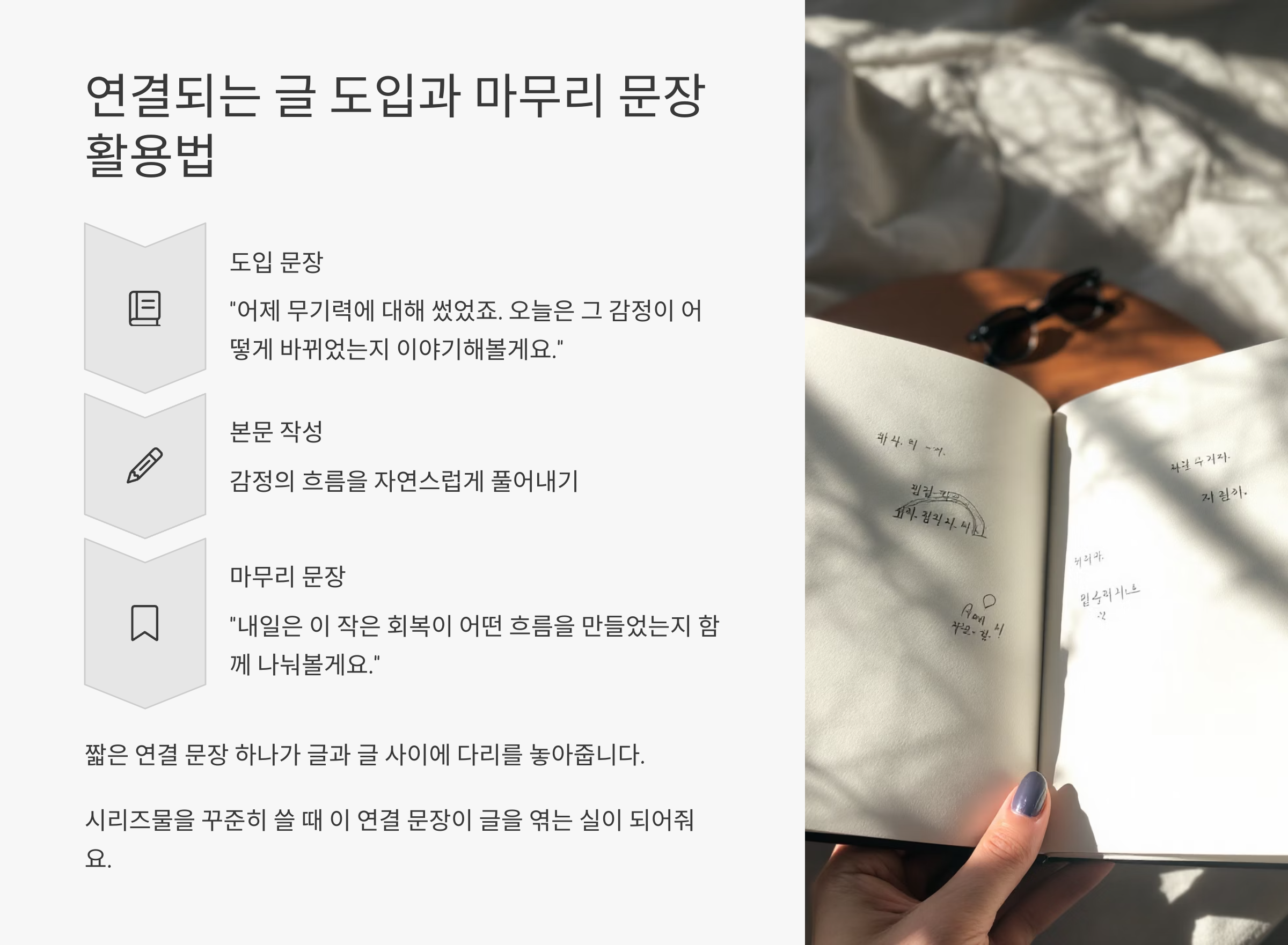 - 도입에 “어제 무기력에 대해 썼었죠, 오늘은 그 감정이 어떻게 바뀌었는지 이야기해볼게요.”