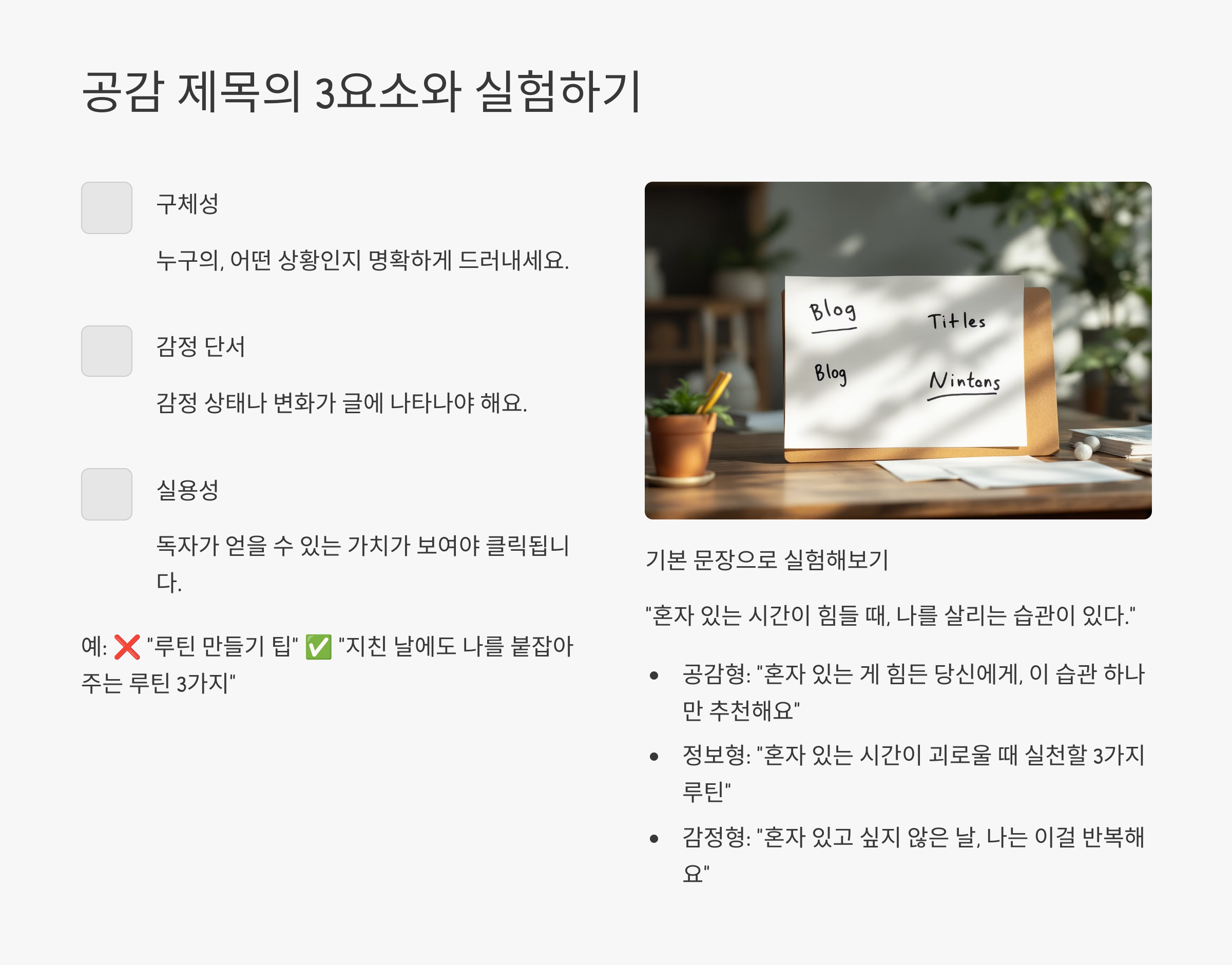공감받는 제목엔 보통 이 세 가지가 들어 있어요: