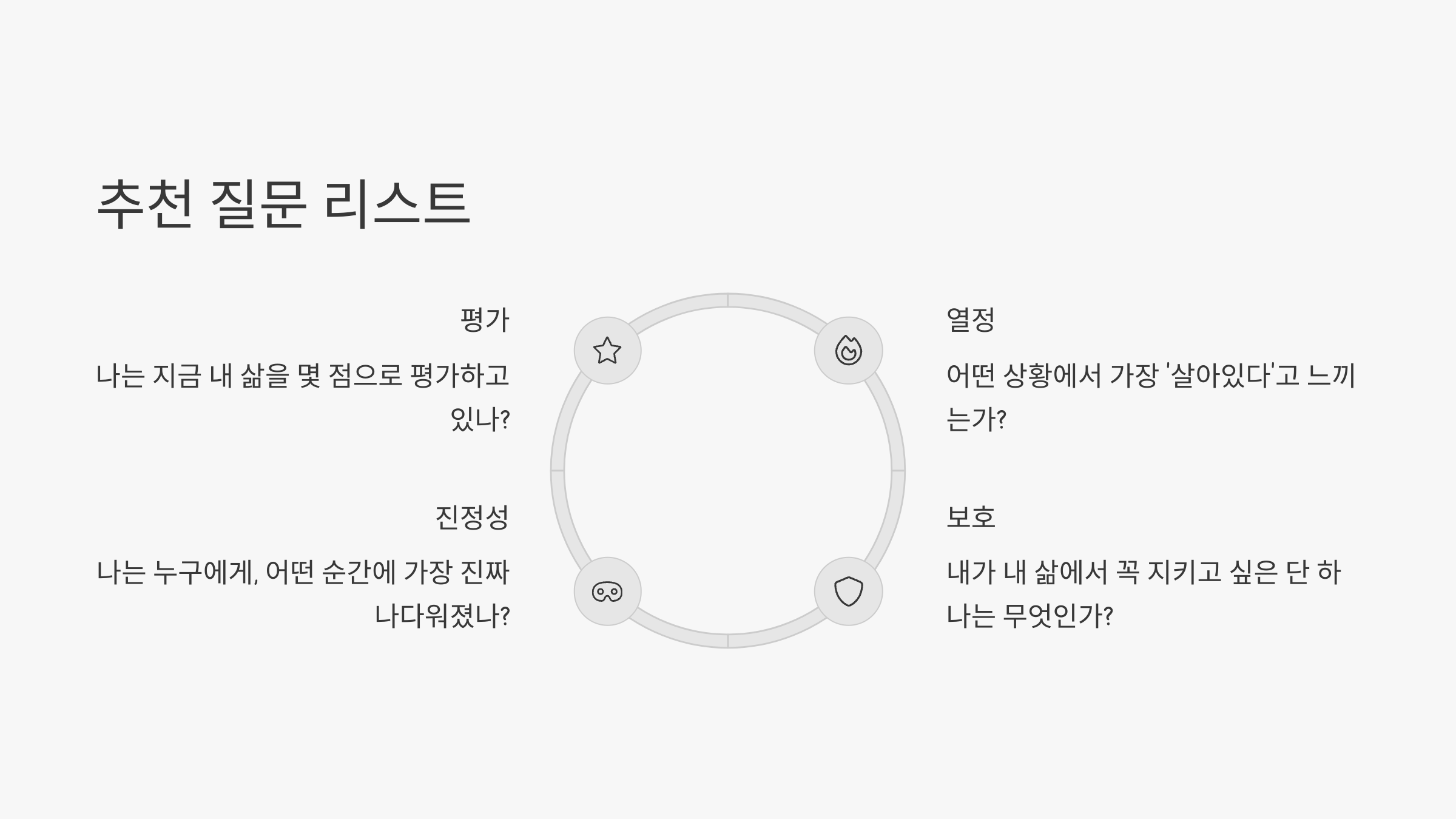 - 지금 당장 삶에서 가장 지키고 싶은 가치는 무엇인가요?