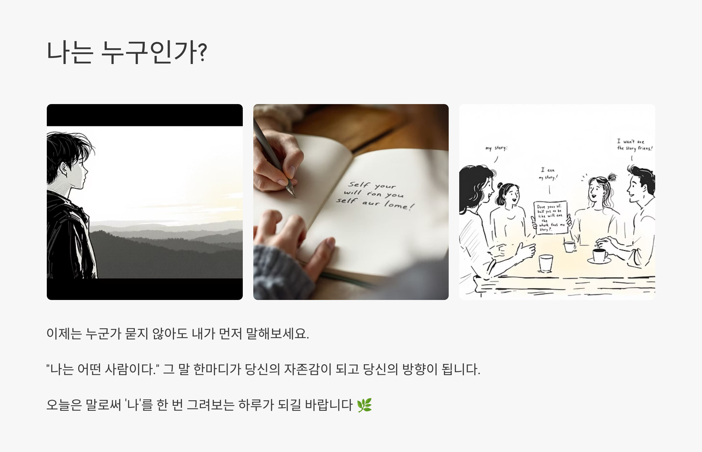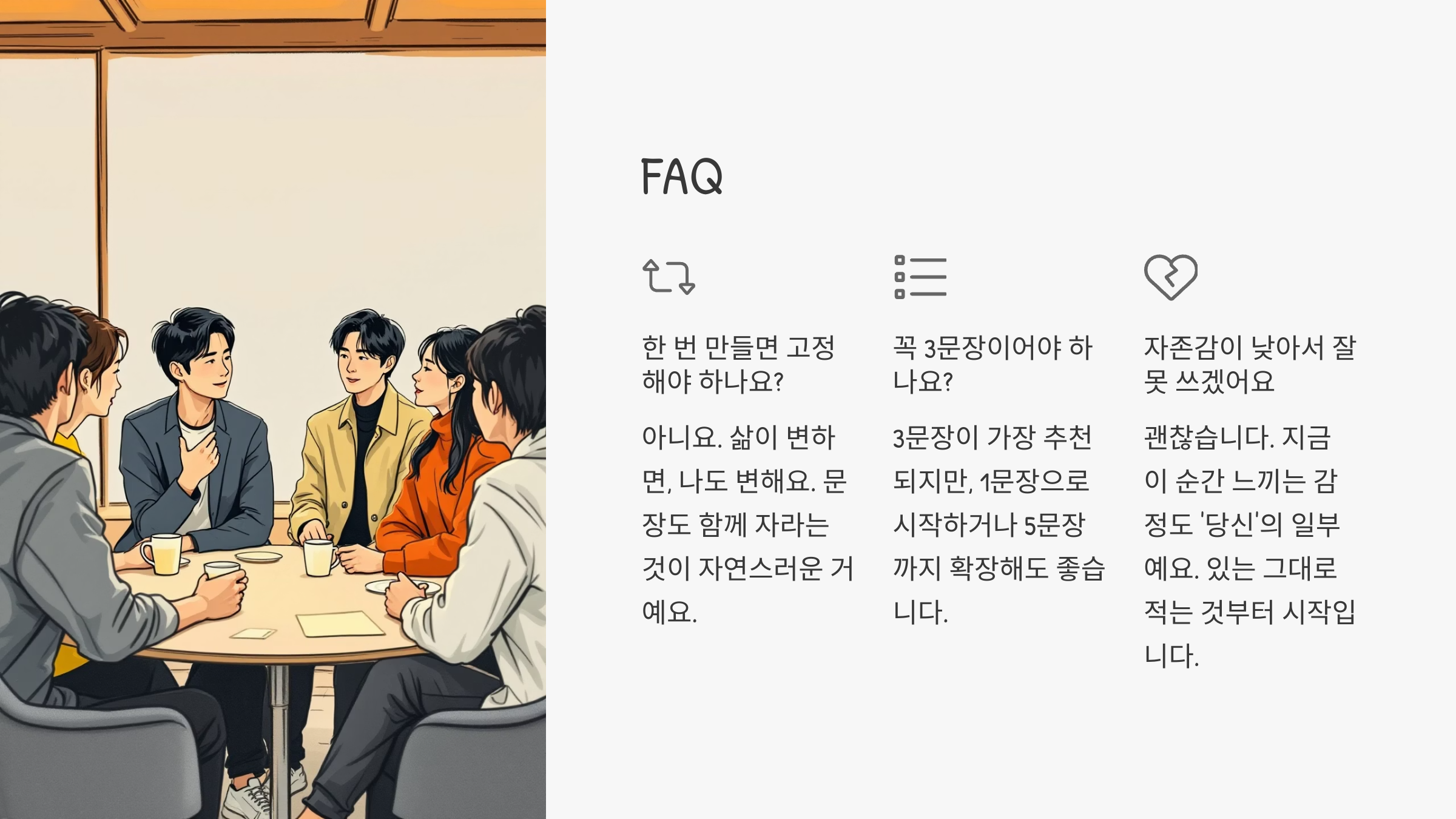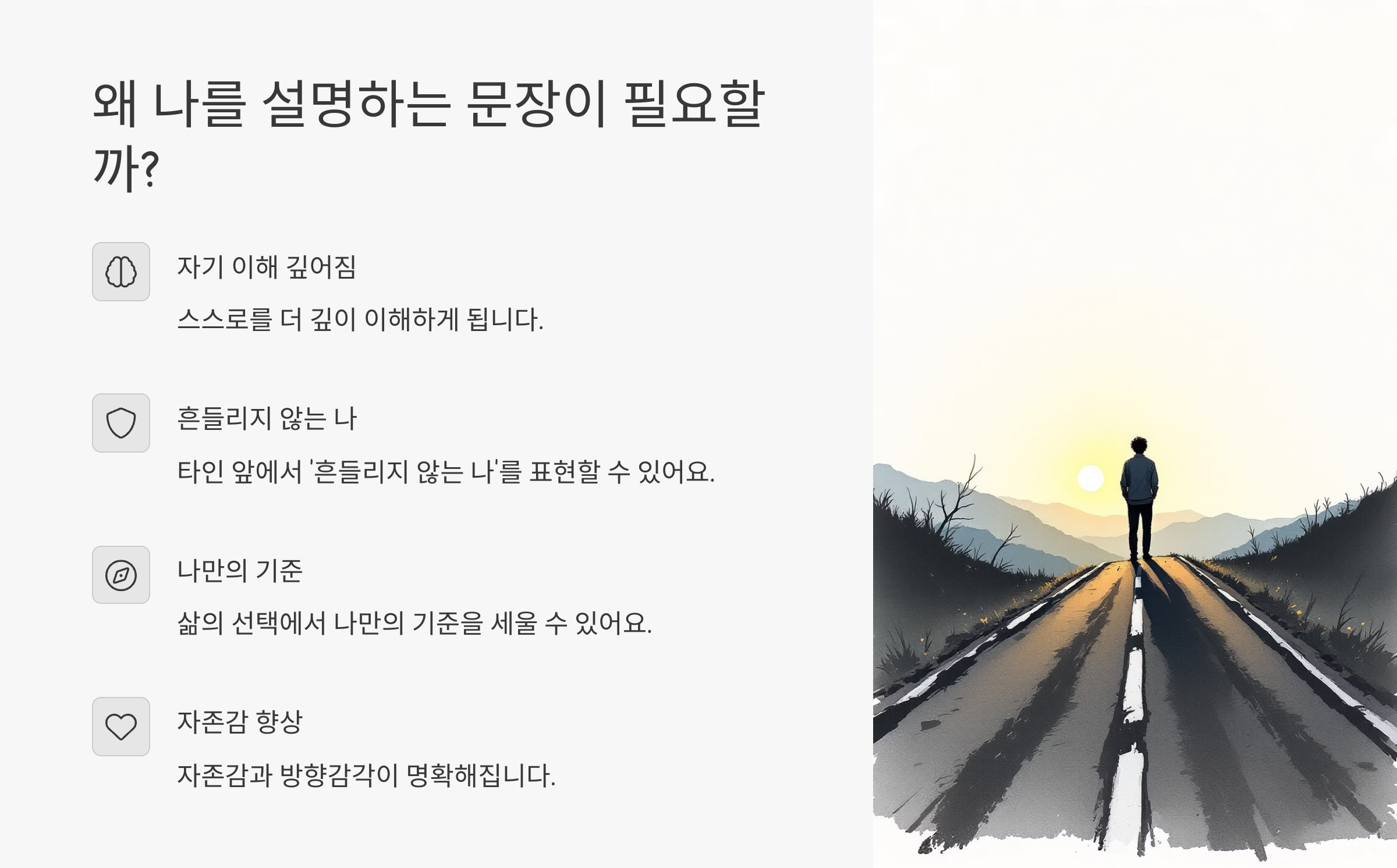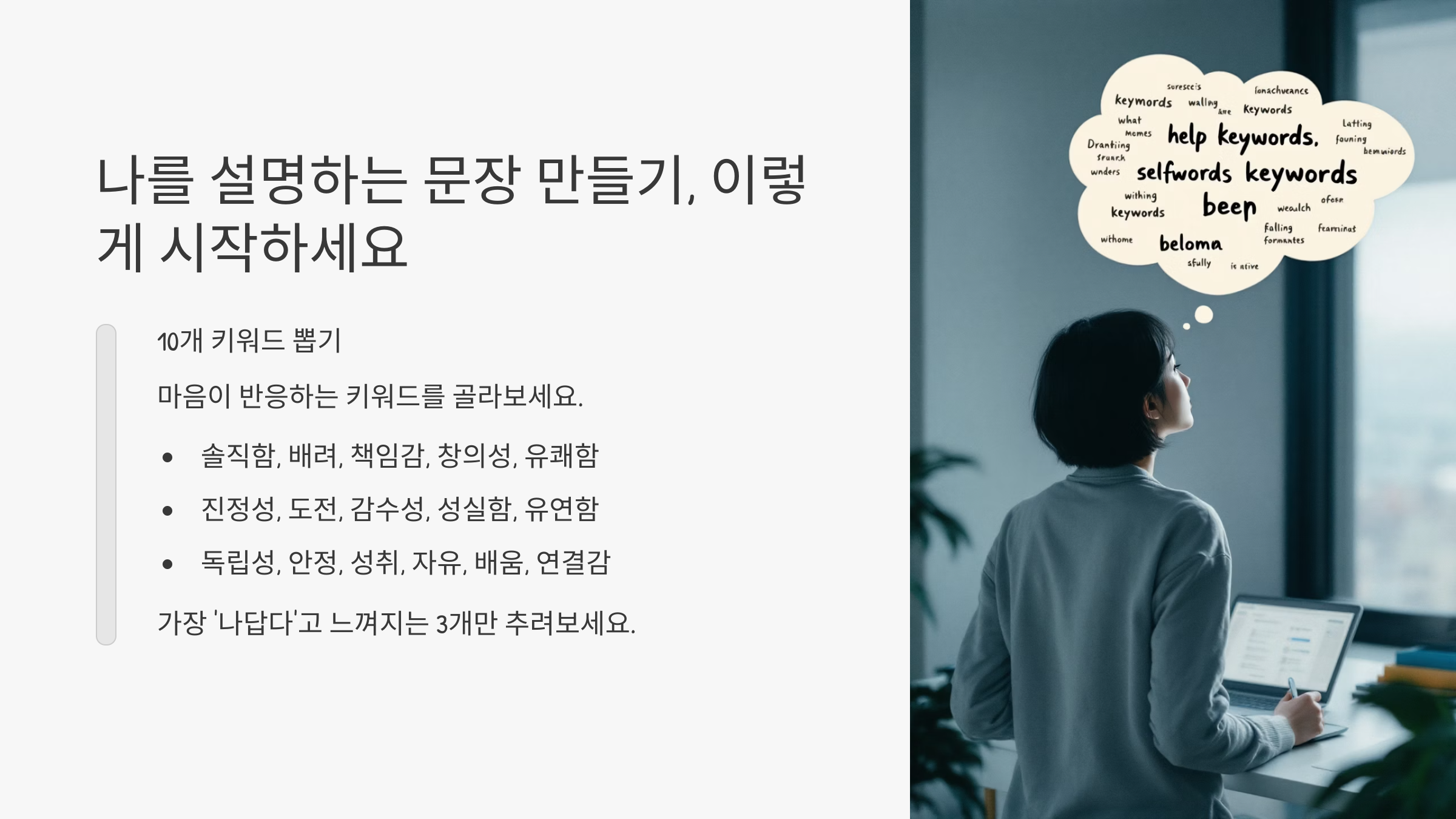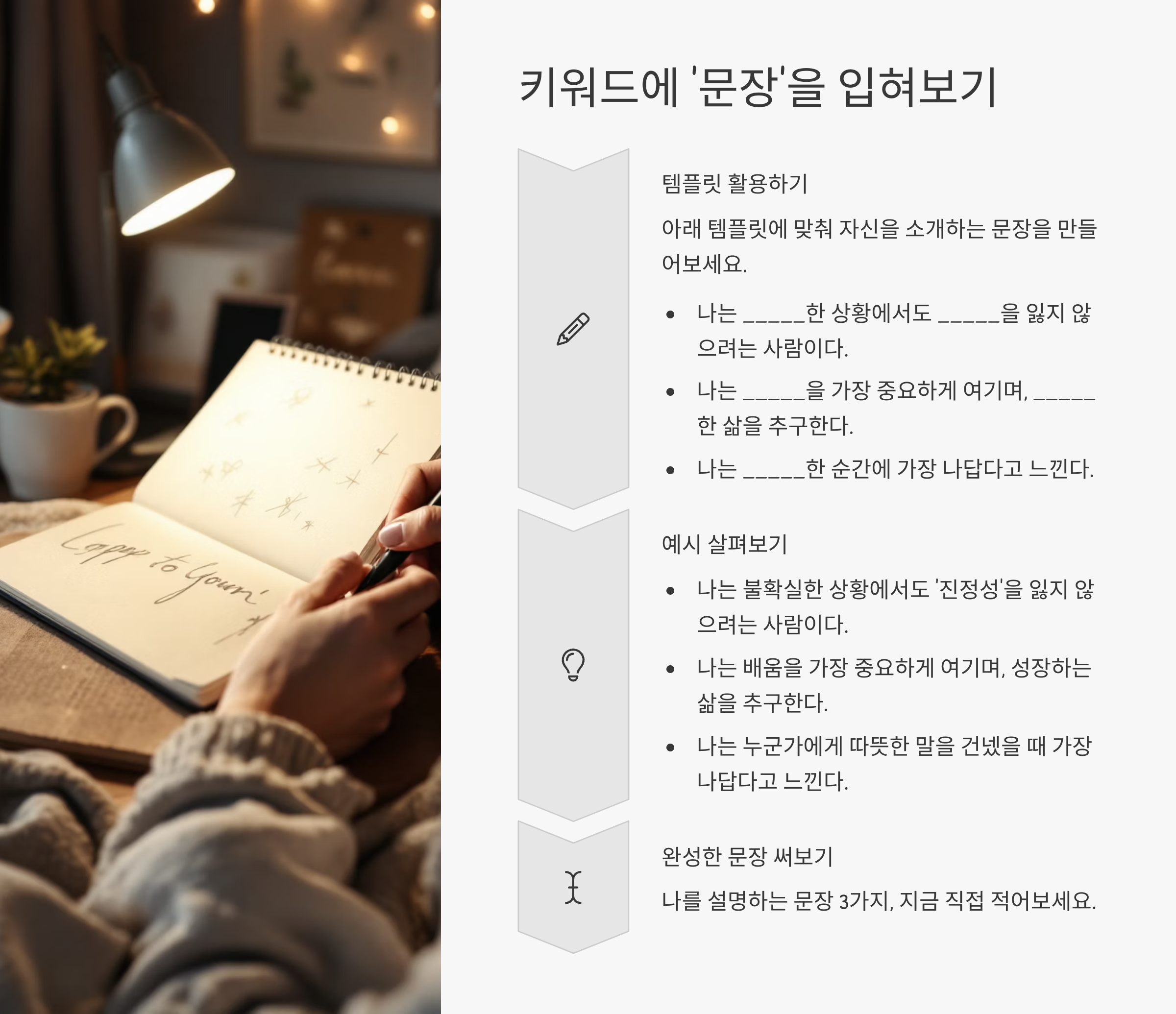 👉 키워드 + 경험 + 감정 = 당신의 정체성을 말하는 문장입니다.
