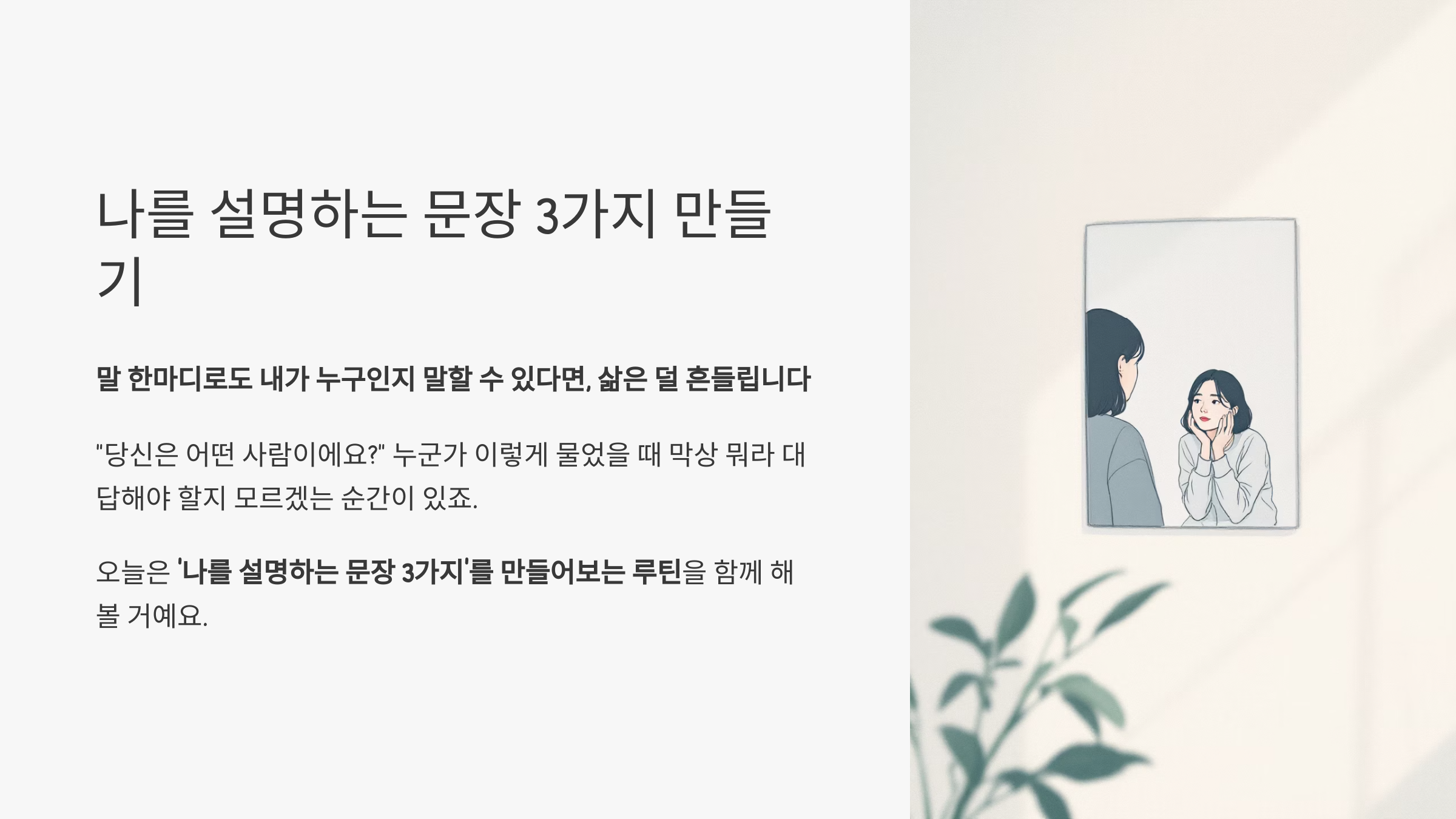 ‘나를 설명하는 문장 3가지’를 만들어보는 루틴을 함께 해볼 거예요.