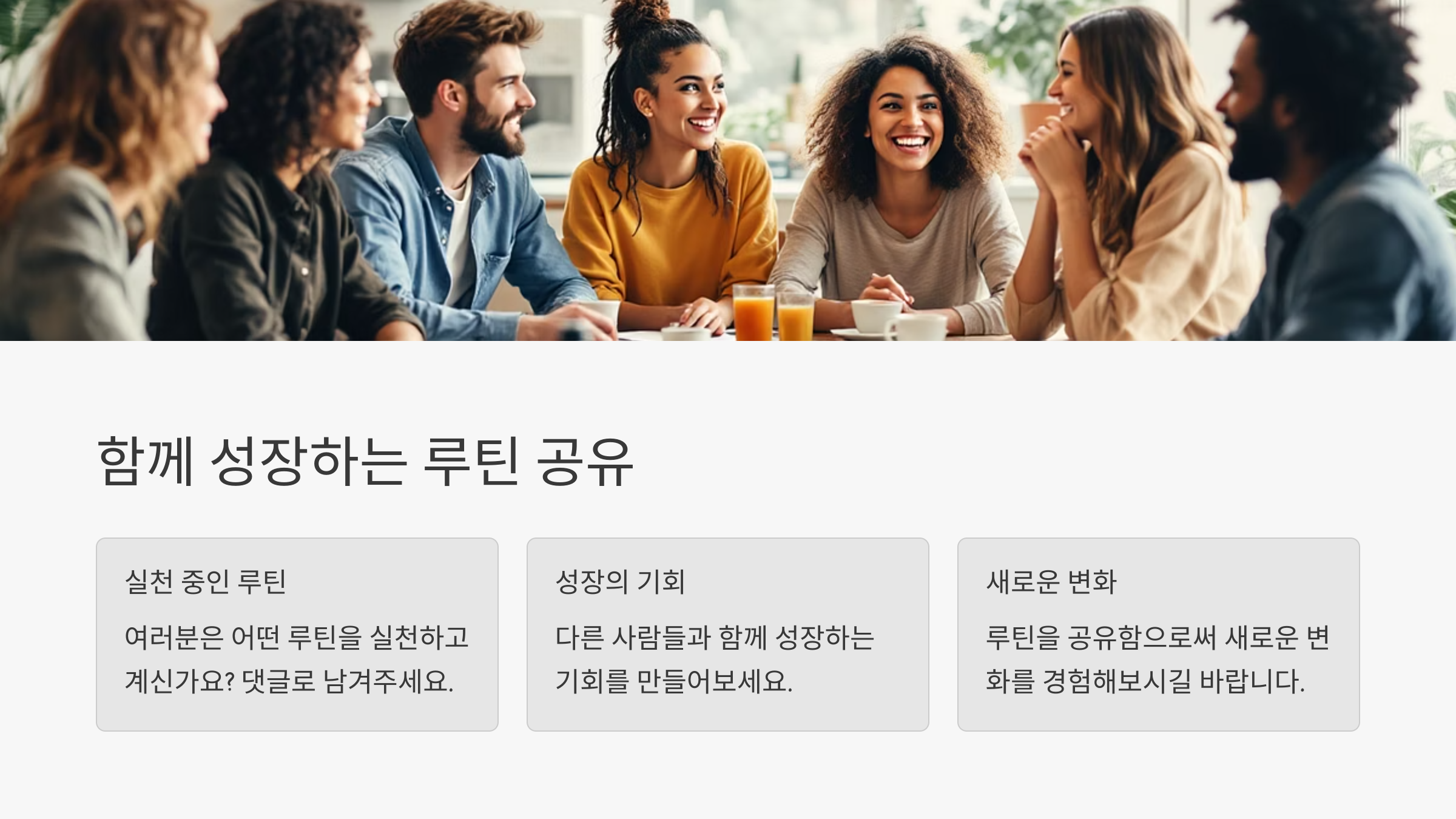 여러분은 어떤 루틴을 실천하고 계신가요? 공유하고 싶은 루틴이 있다면 댓글로 남겨주세요! 다른 사람들과 함께 성장하는 기회를 만들어보세요.