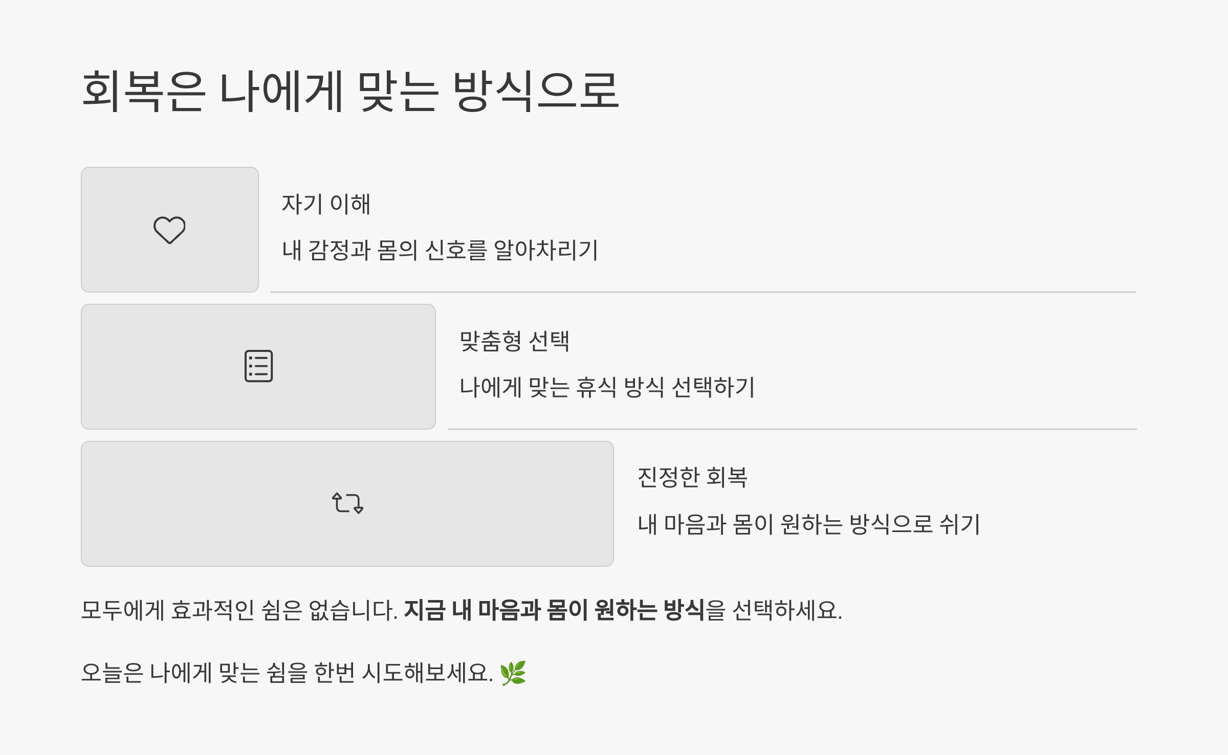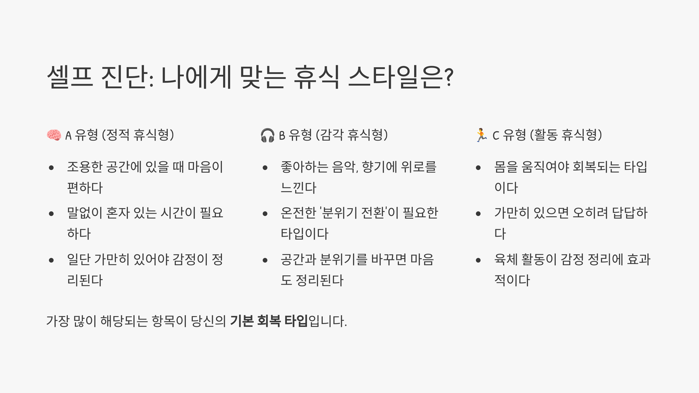 👉 가장 많이 해당되는 항목이 당신의 기본 회복 타입입니다.