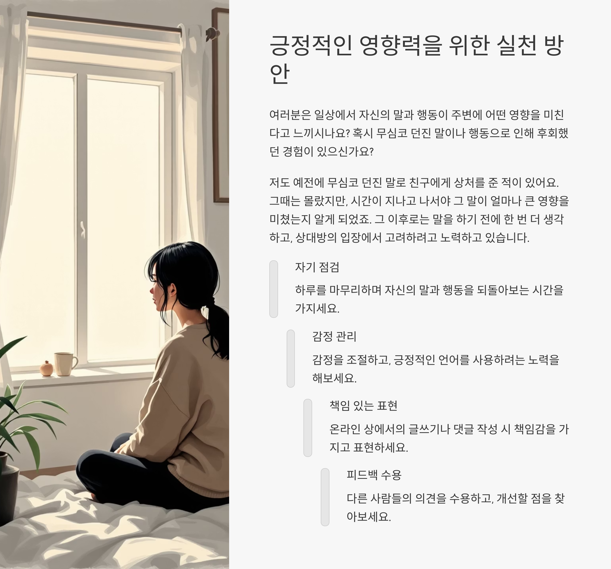 여러분은 일상에서 자신의 말과 행동이 주변에 어떤 영향을 미친다고 느끼시나요? 혹시 무심코 던진 말이나 행동으로 인해 후회했던 경험이 있으신가요? 여러분의 이야기를 댓글로 공유해 주세요!