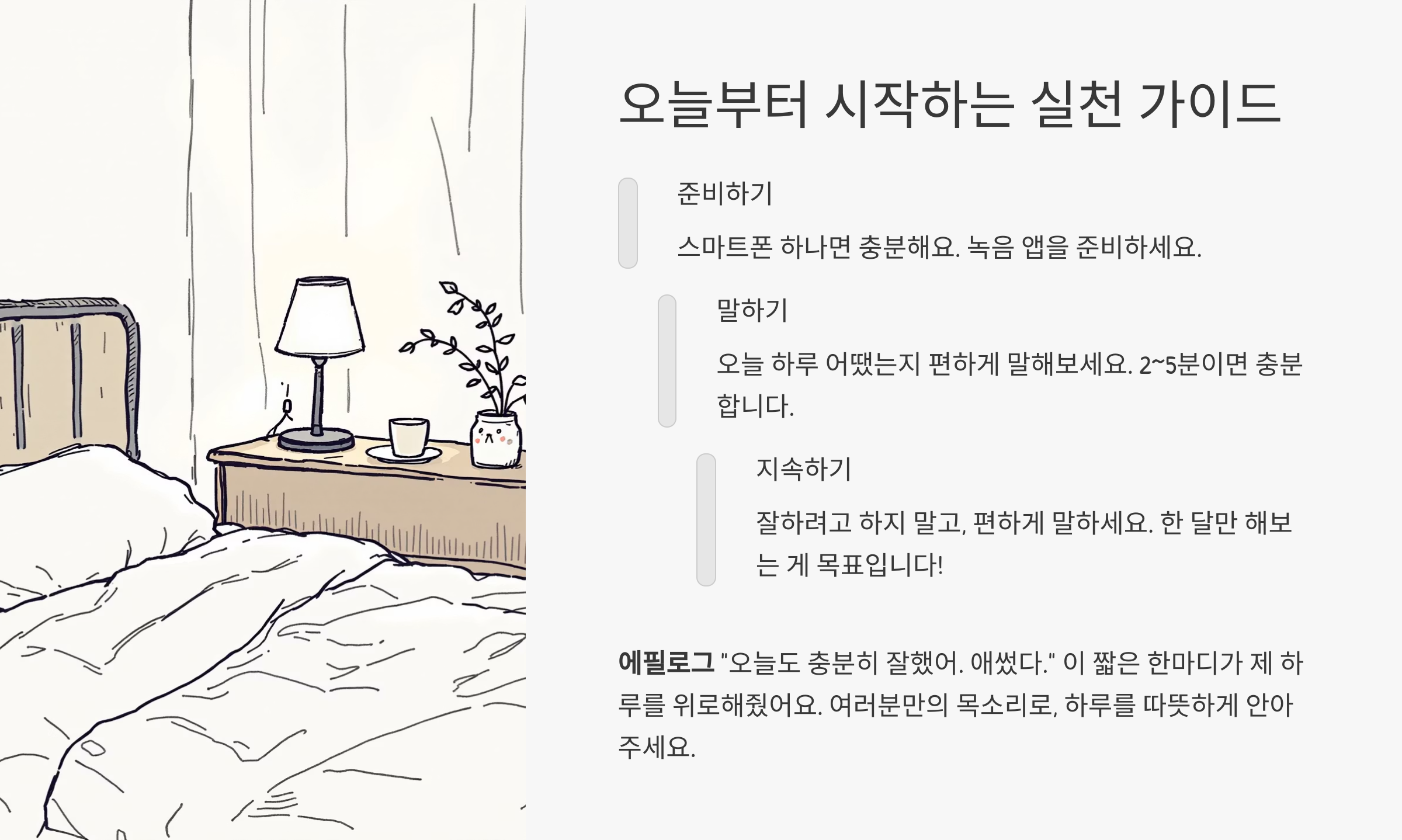 - 목소리를 들으며 지나온 하루를 따뜻하게 정리할 수 있었어요