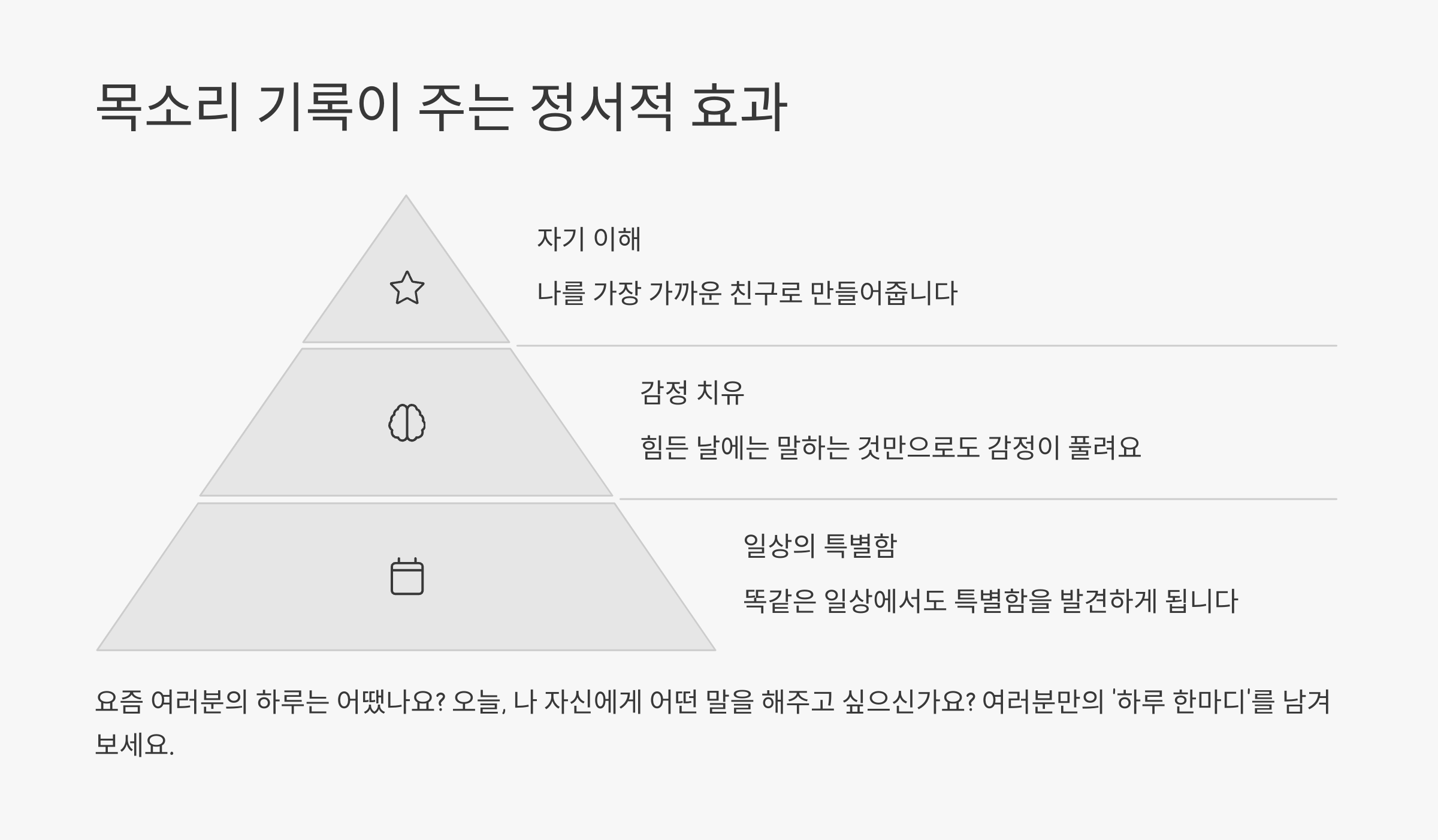 하루를 기록하는 방식은 다양하지만, 그중에서도 '내 목소리로 말하기'는 가장 자연스럽고 진심이 잘 묻어나는 방법이에요. 글로 쓸 땐 다듬어야 할 것 같고, 어딘가 정리된 느낌이 드는데, 말로 할 때는 오히려 감정과 생각이 그대로 드러나죠. 나 자신에게 말을 거는 이 작은 루틴이 내 마음을 들여다보는 창이 되어줍니다.
