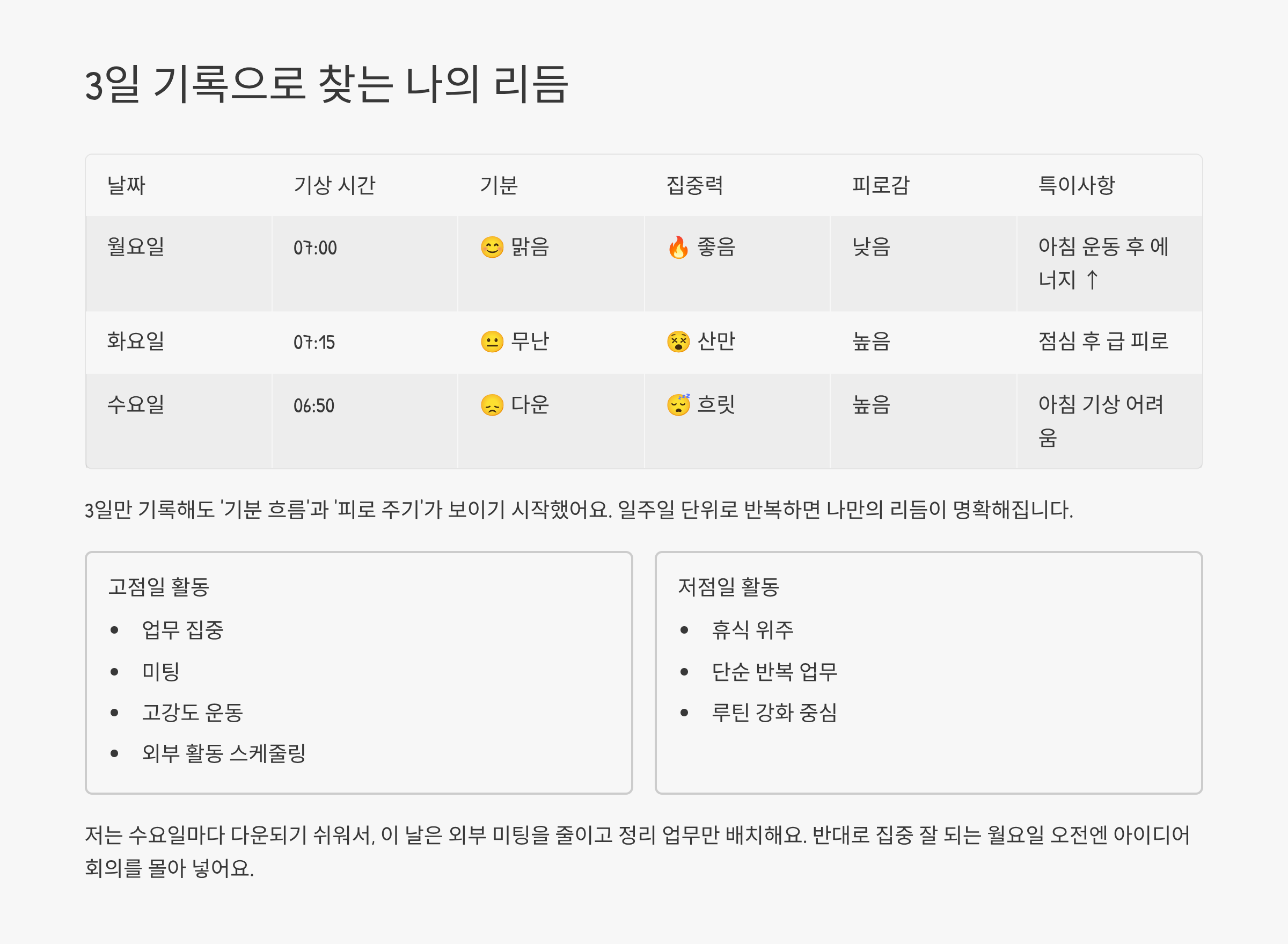 3일만 기록해도 ‘기분 흐름’과 ‘피로 주기’가 보이기 시작했어요. 일주일 단위로 반복하면 나만의 리듬이 명확해집니다.