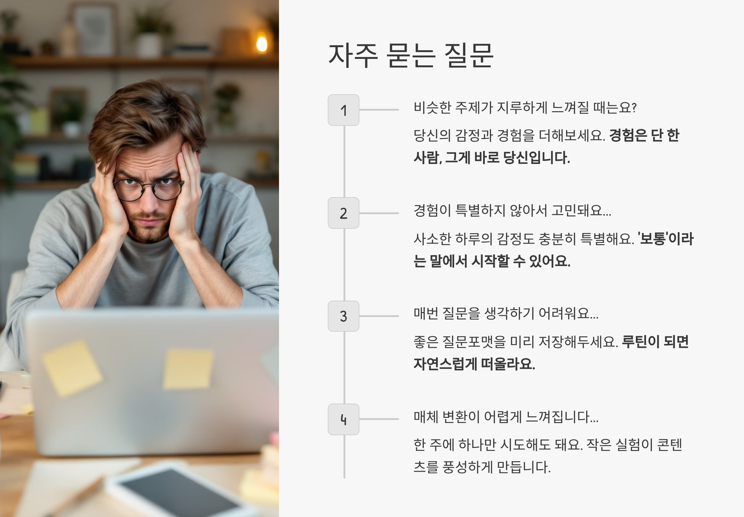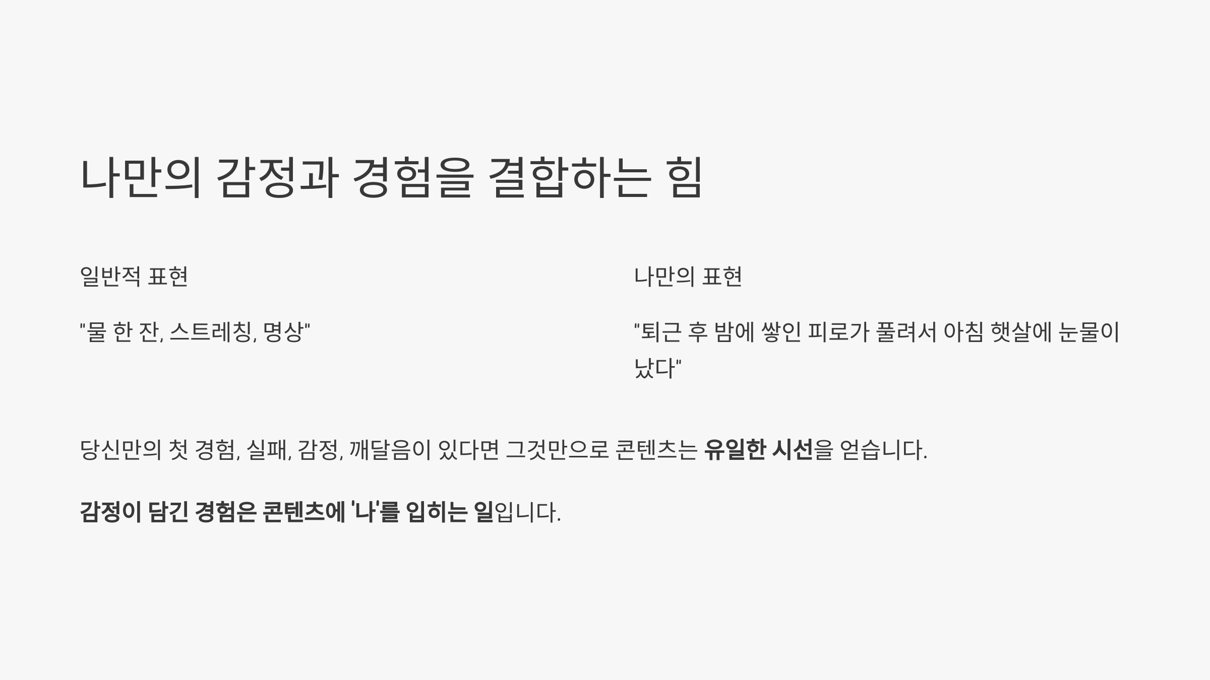 👉 감정이 담긴 경험은 콘텐츠에 ‘나’를 입히는 일입니다.