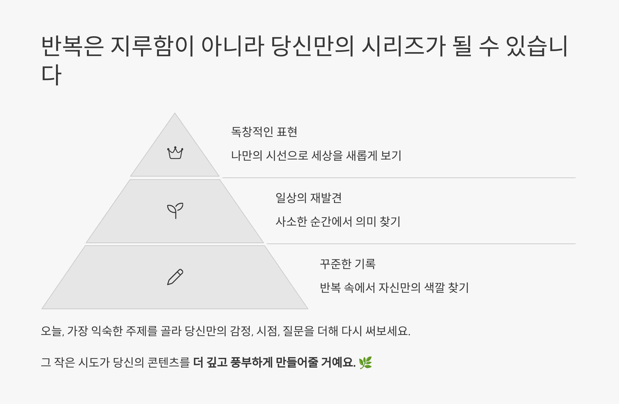 - 개인 기록(사진/음성/메모)을 콘텐츠 초석으로 두세요.