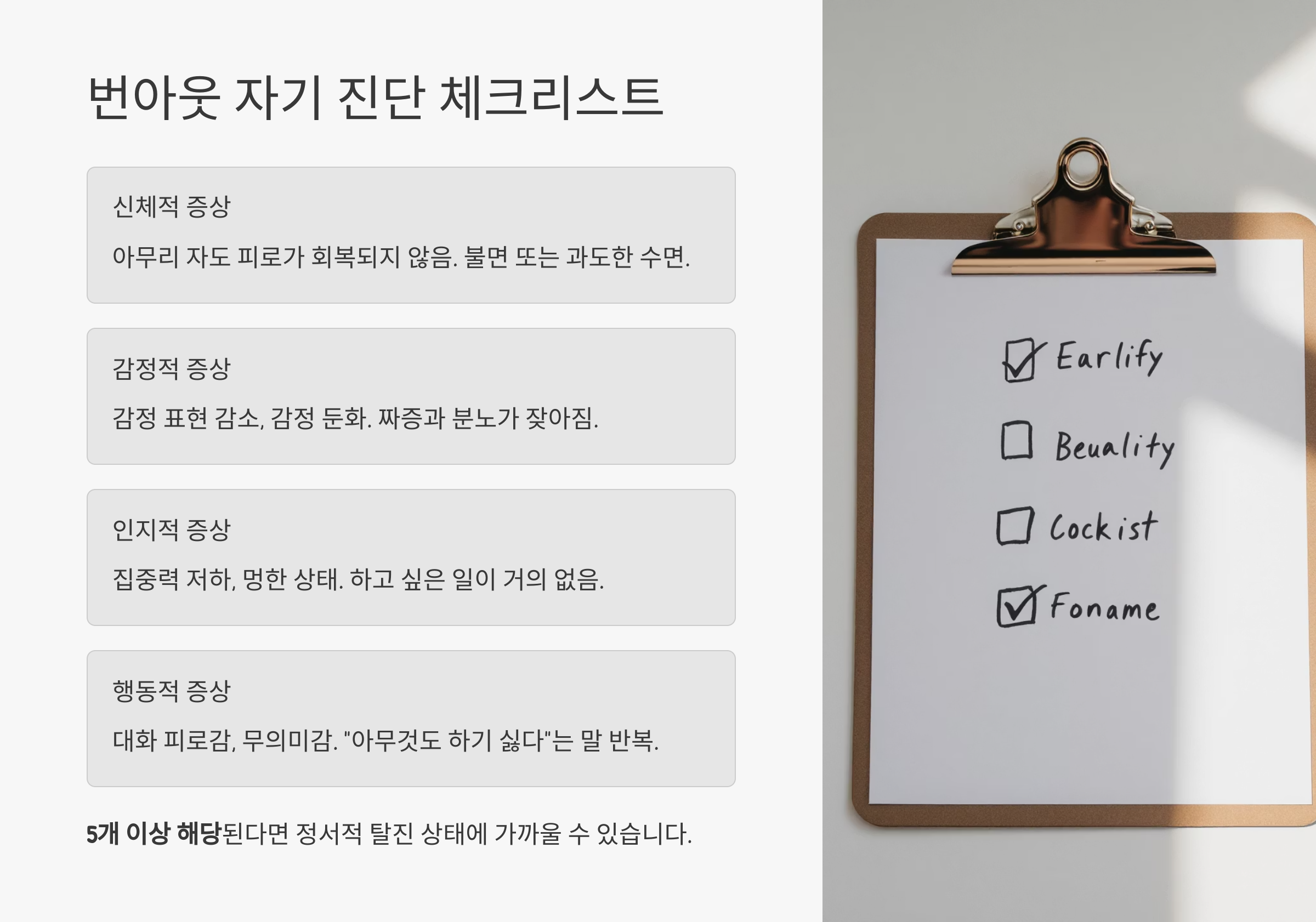 번아웃 징후를 스스로 감지할 수 있는 자기 진단법을 알려드릴게요.