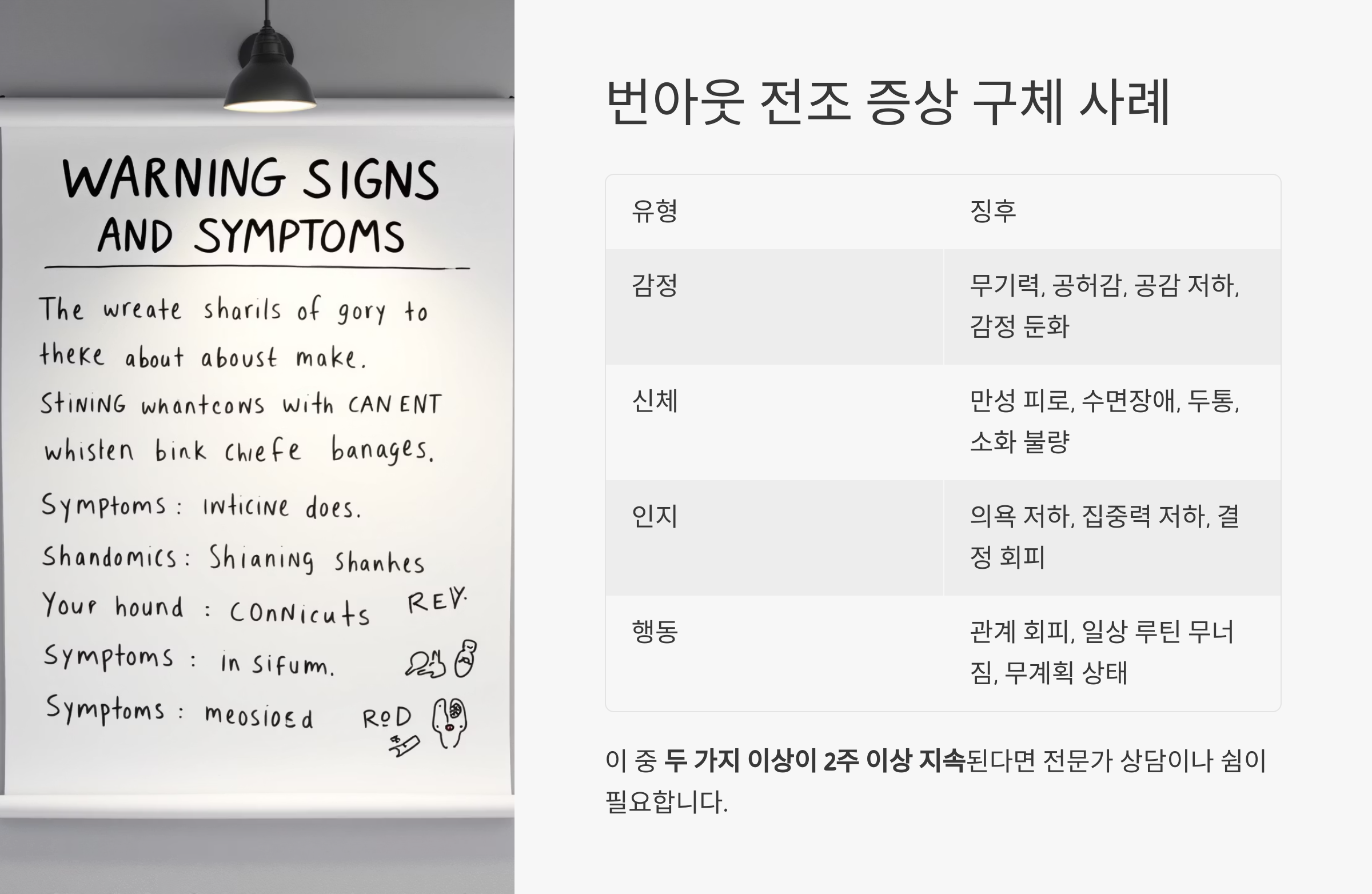 번아웃은 정신력이 강한 사람일수록 더 깊게 빠질 수 있는 문제입니다.