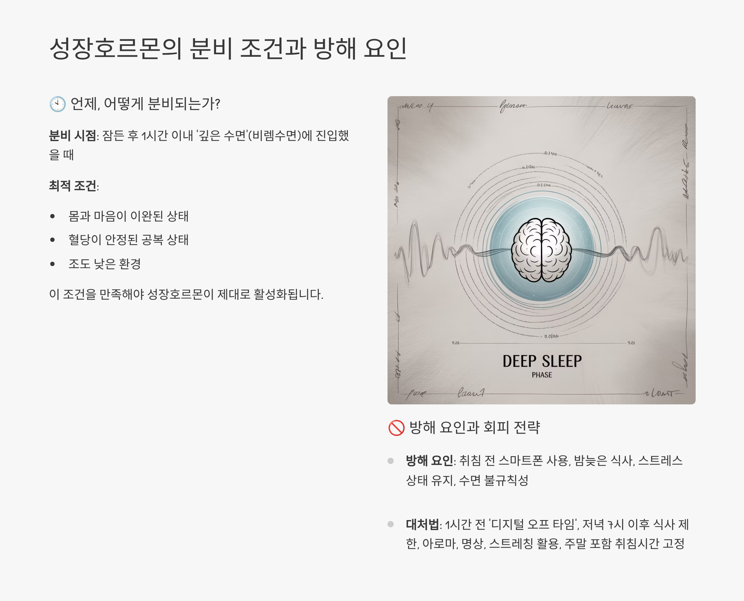 - 분비 시점: 잠든 후 1시간 이내 ‘깊은 수면’(비렘수면)에 진입했을 때