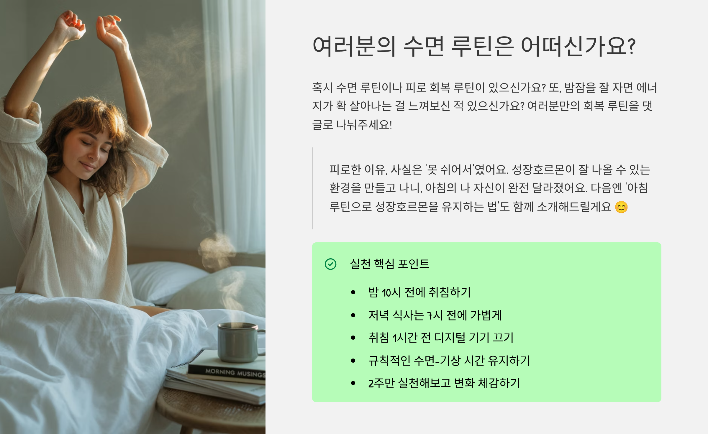 다음엔 ‘아침 루틴으로 성장호르몬을 유지하는 법’도 함께 소개해드릴게요 😊