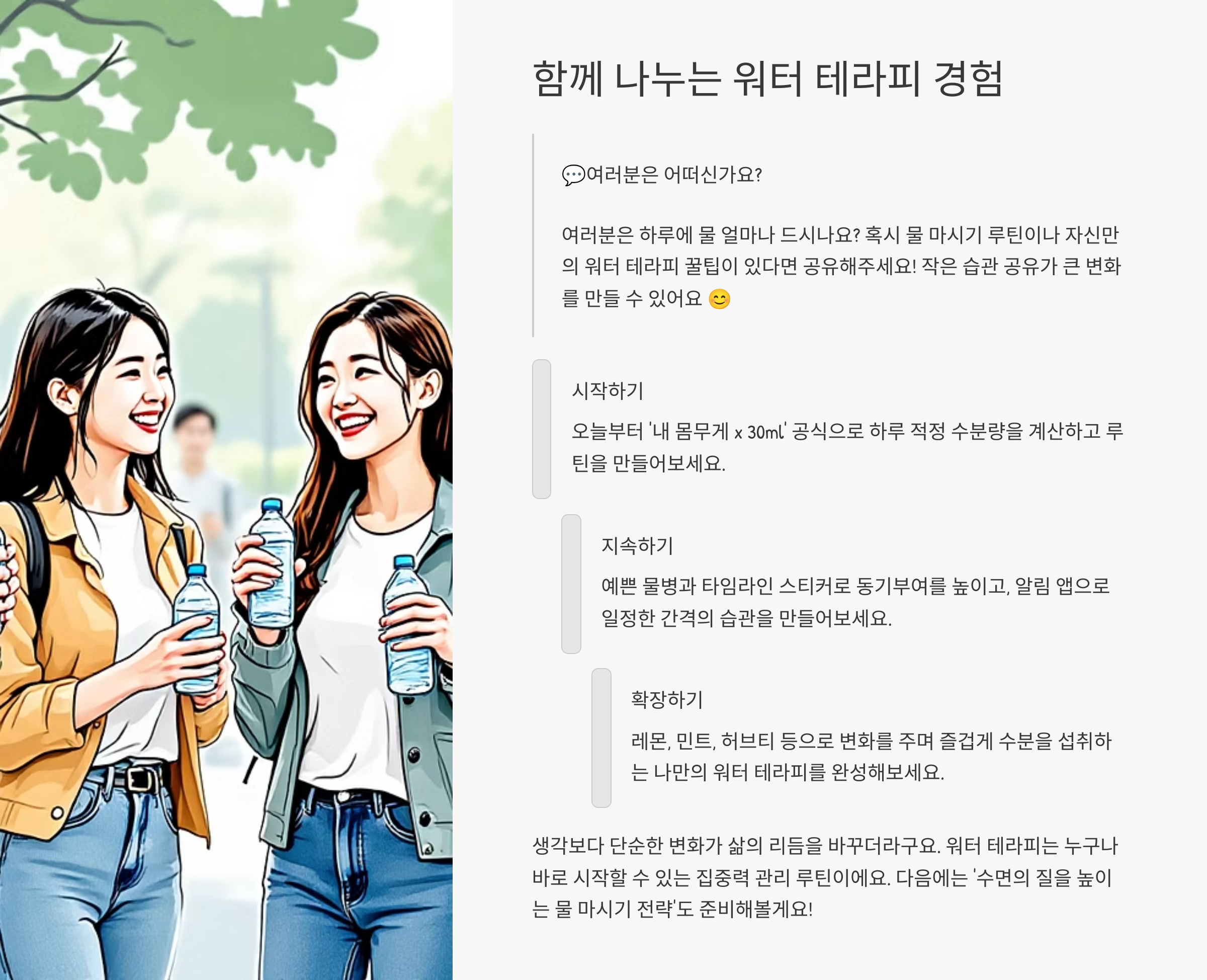 혹시 물 마시기 루틴이나 자신만의 워터 테라피 꿀팁이 있다면 댓글로 꼭 공유해주세요!