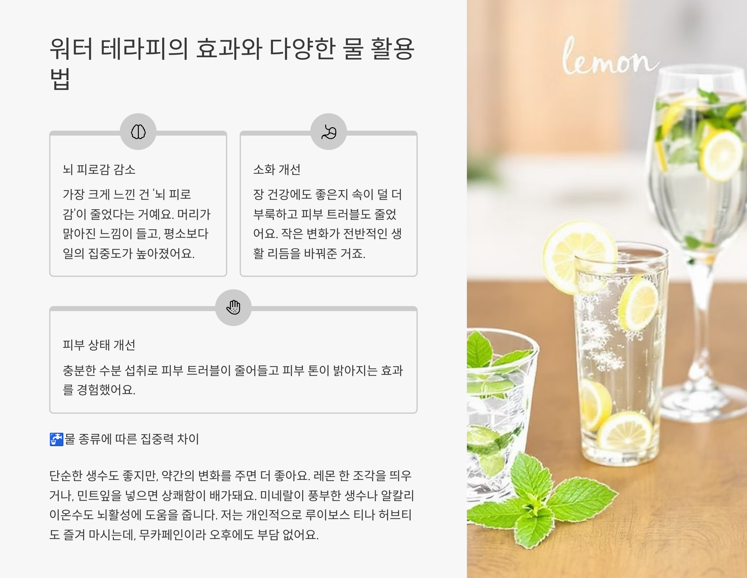 머리가 맑아진 느낌이 들고, 평소보다 일의 집중도가 높아졌어요. 또 장 건강에도 좋은지 속이 덜 더부룩하고 피부 트러블도 줄었어요. 작은 변화가 전반적인 생활 리듬을 바꿔준 거죠. 하루 2리터 물 습관, 진짜 효과 있더라구요!