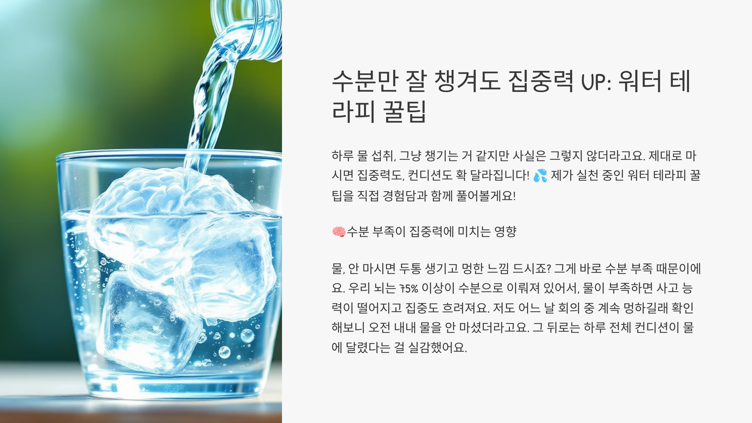 생각보다 단순한 변화가 삶의 리듬을 바꾸더라구요. 워터 테라피는 누구나 바로 시작할 수 있는 집중력 관리 루틴이에요. 다음에는 ‘수면의 질을 높이는 물 마시기 전략’도 준비해볼게요!