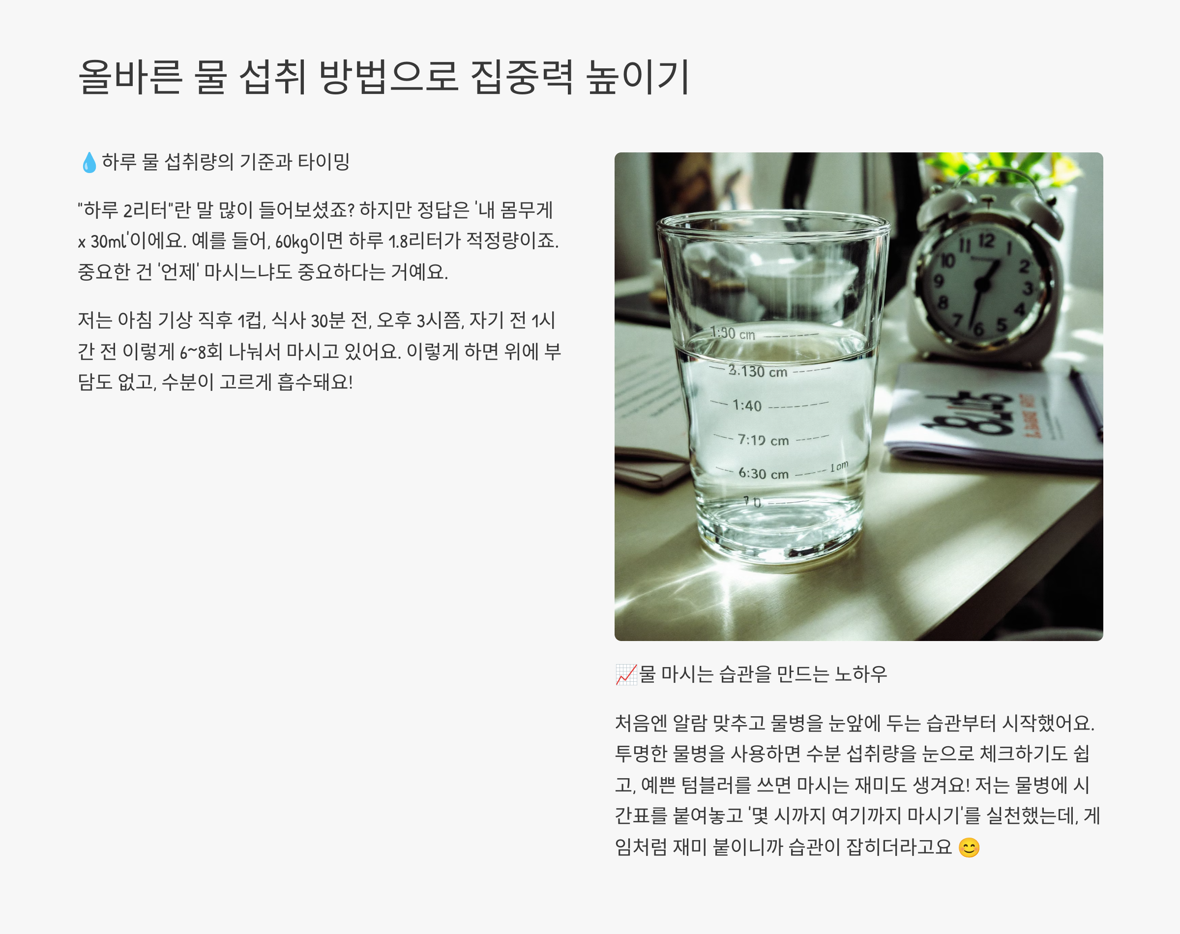 이렇게 루틴을 짜 놓으면 물 마시는 게 습관이 되고, 몸이 스스로 물을 찾게 됩니다. 습관화만 되면 물이 곧 집중력이에요!