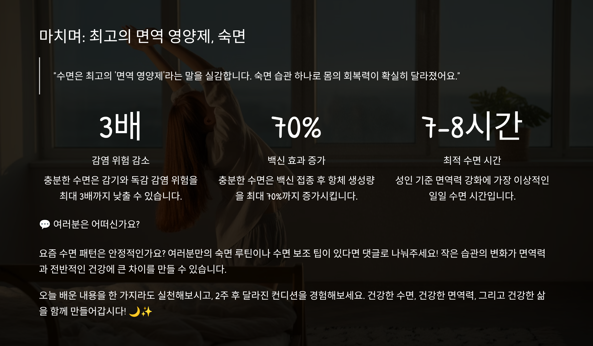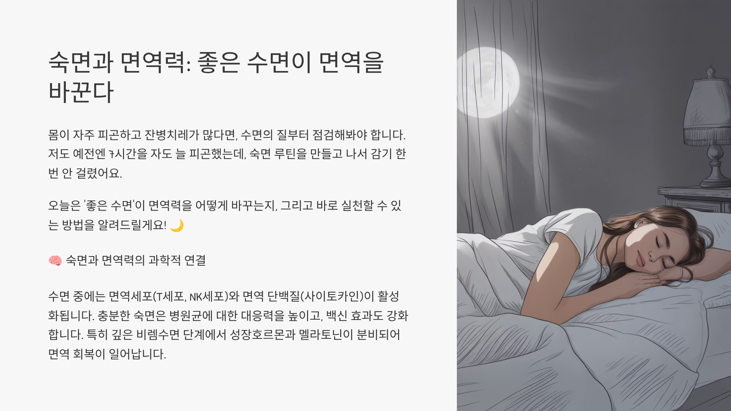 오늘은 ‘좋은 수면’이 면역력을 어떻게 바꾸는지, 그리고 바로 실천할 수 있는 방법을 알려드릴게요! 🌙