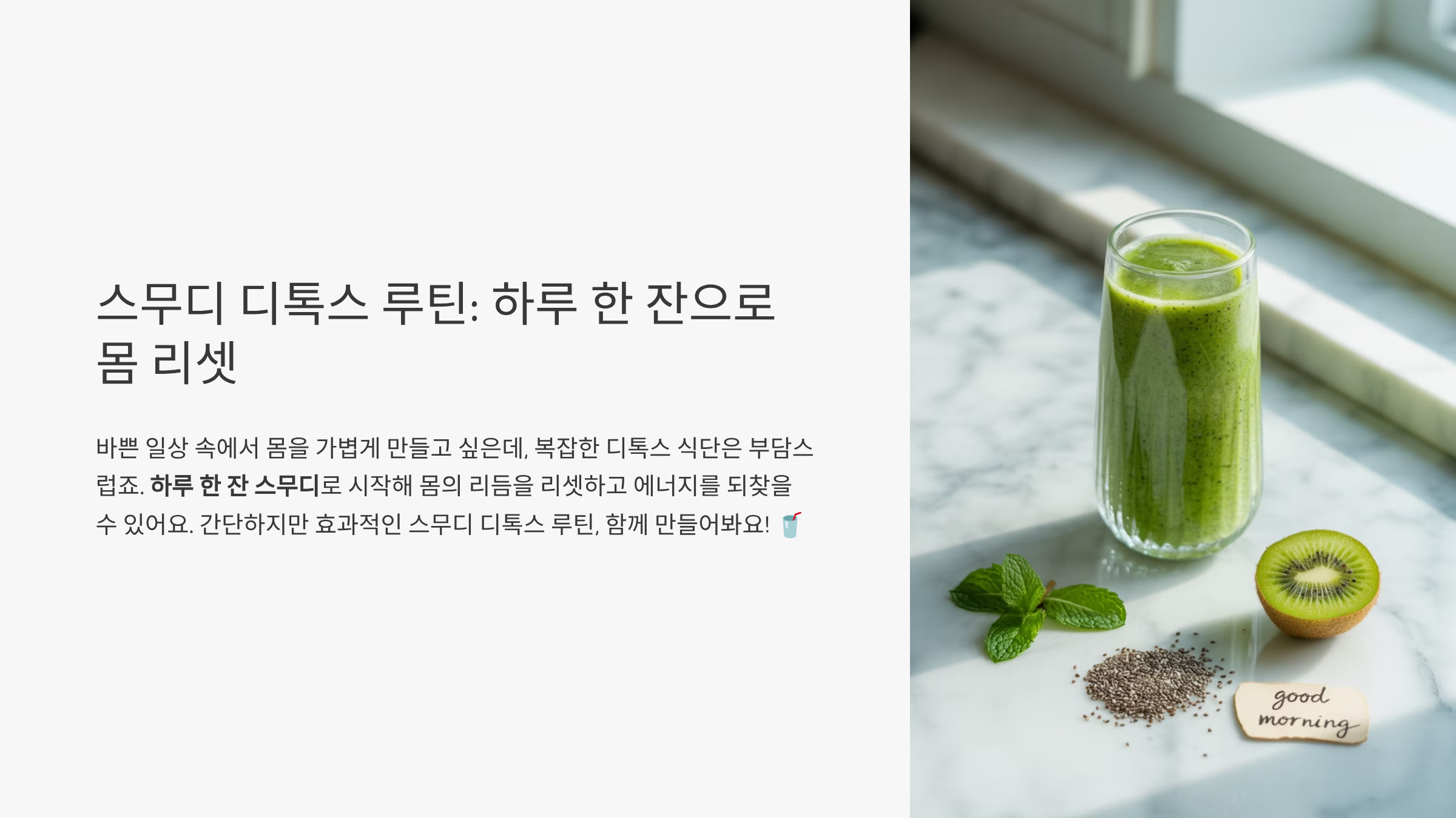 바쁜 일상 속에서 몸을 가볍게 만들고 싶은데, 복잡한 디톡스 식단은 부담스럽죠.