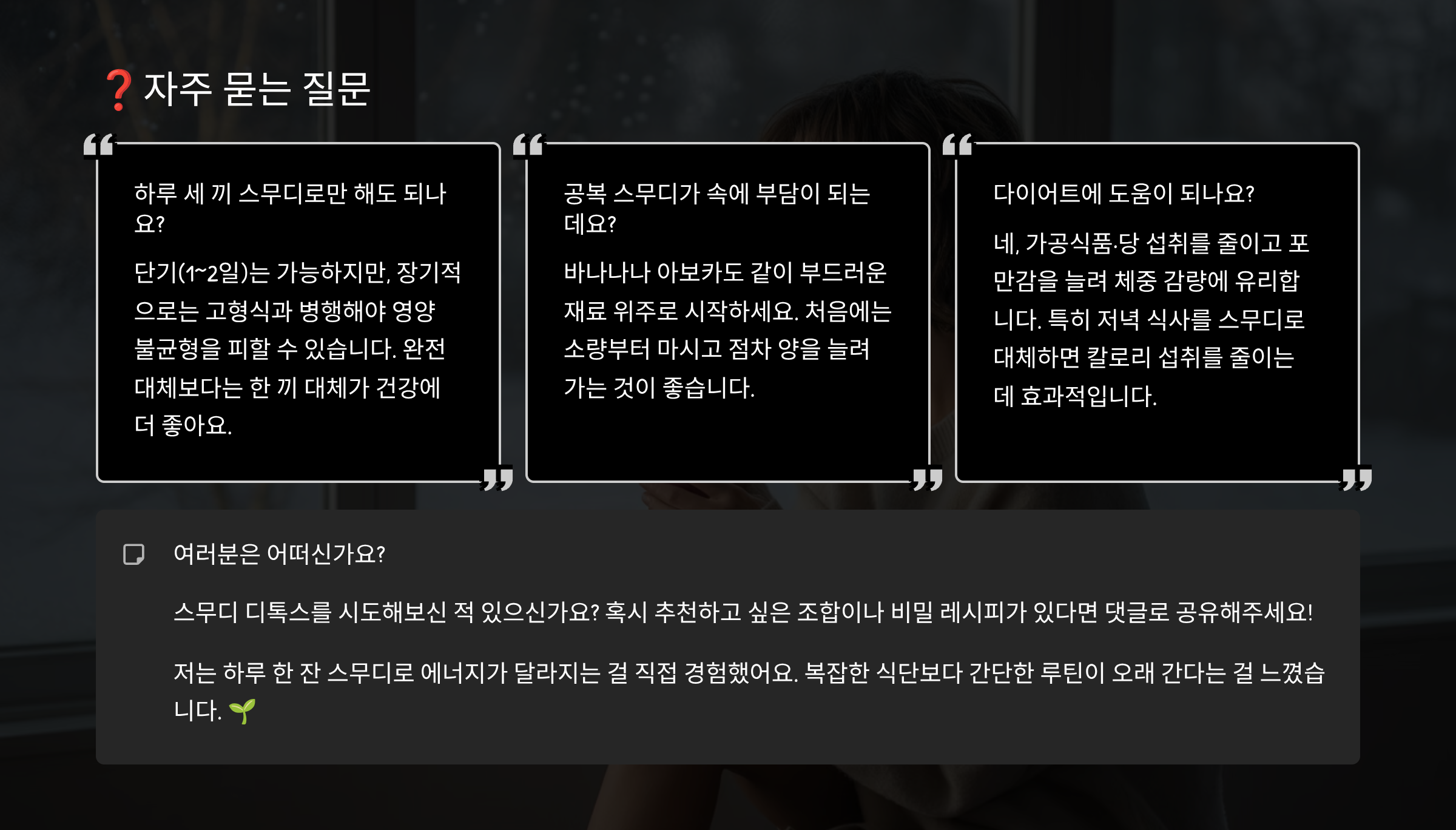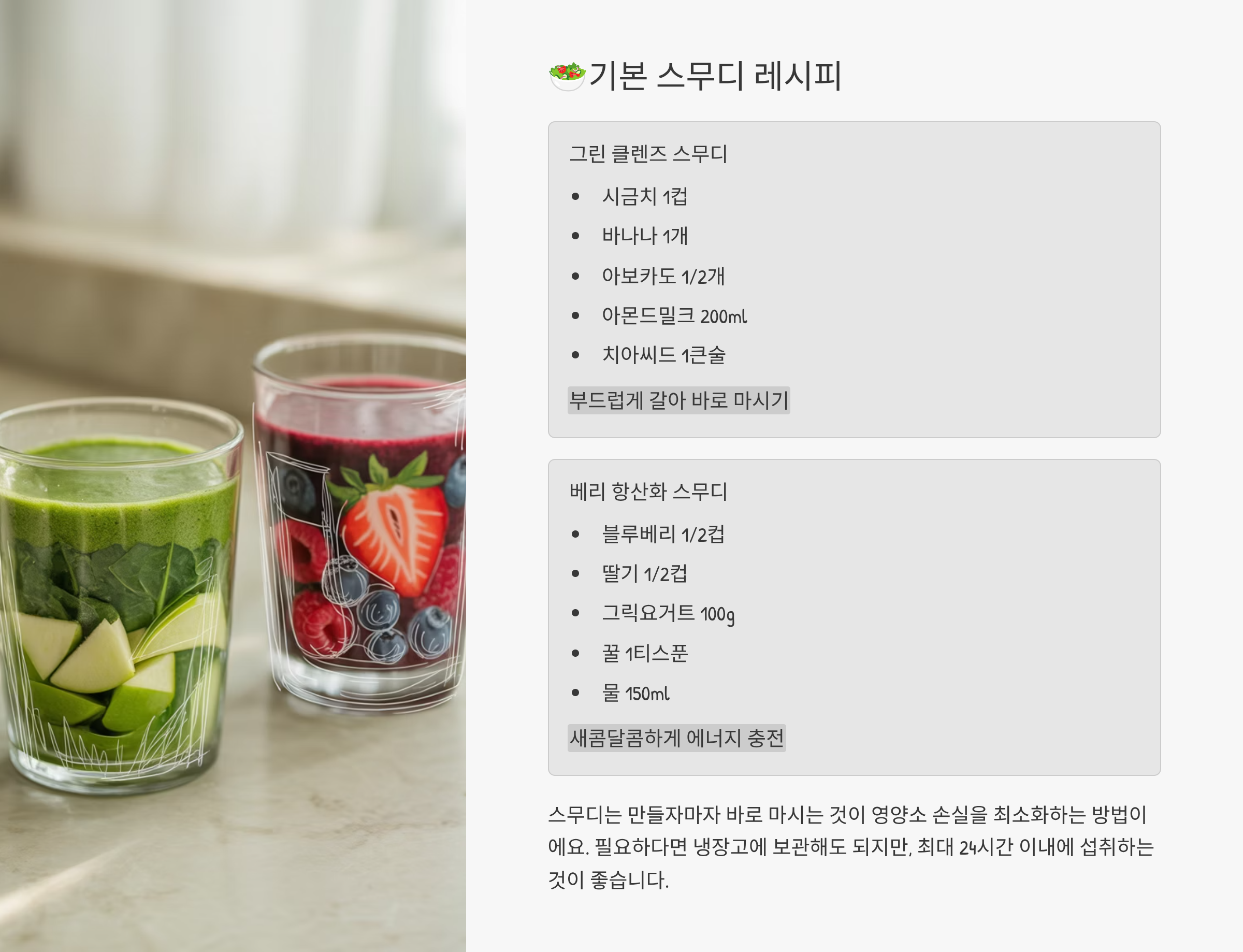 저는 하루 한 잔 스무디로 에너지가 달라지는 걸 직접 경험했어요.