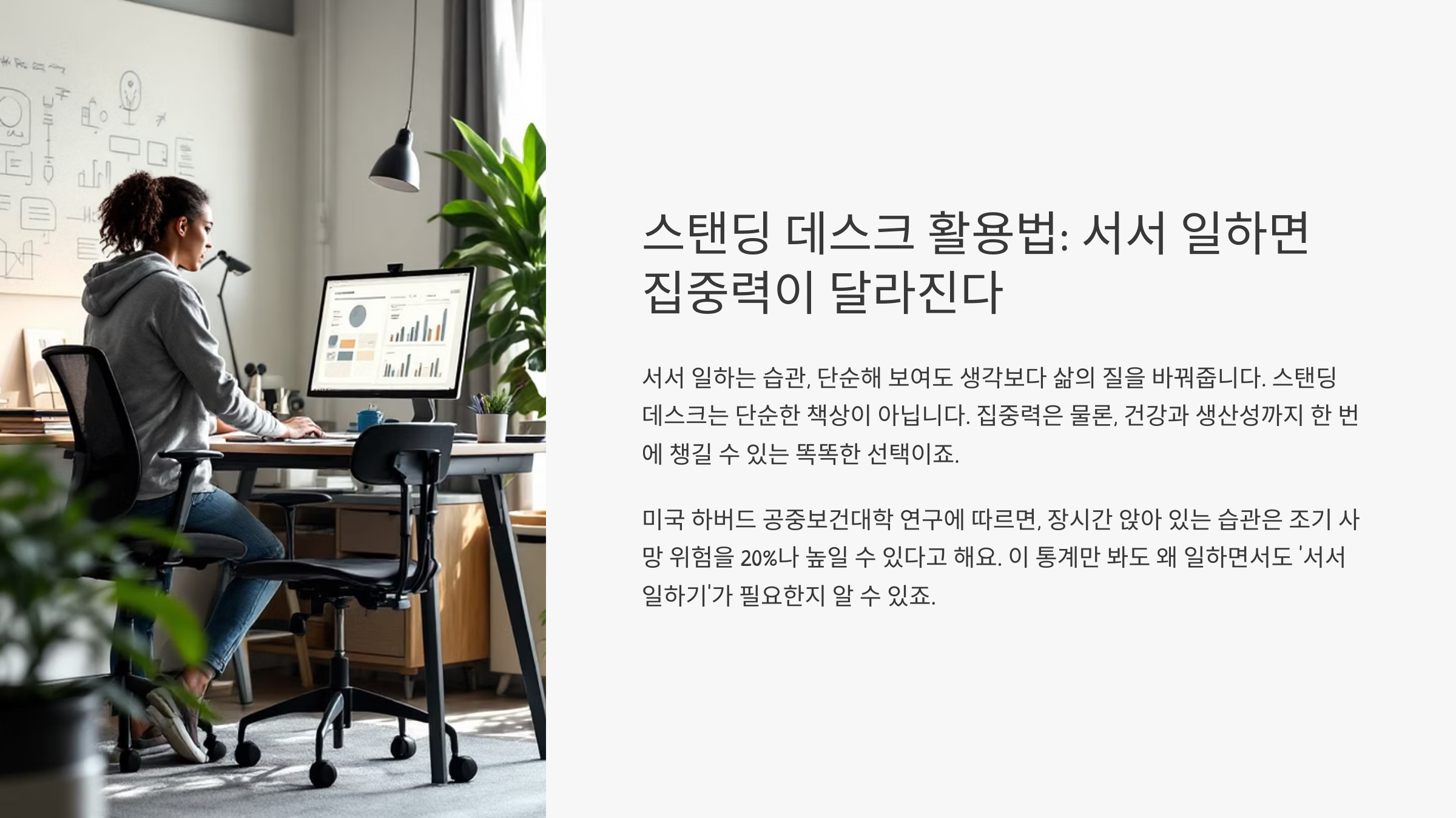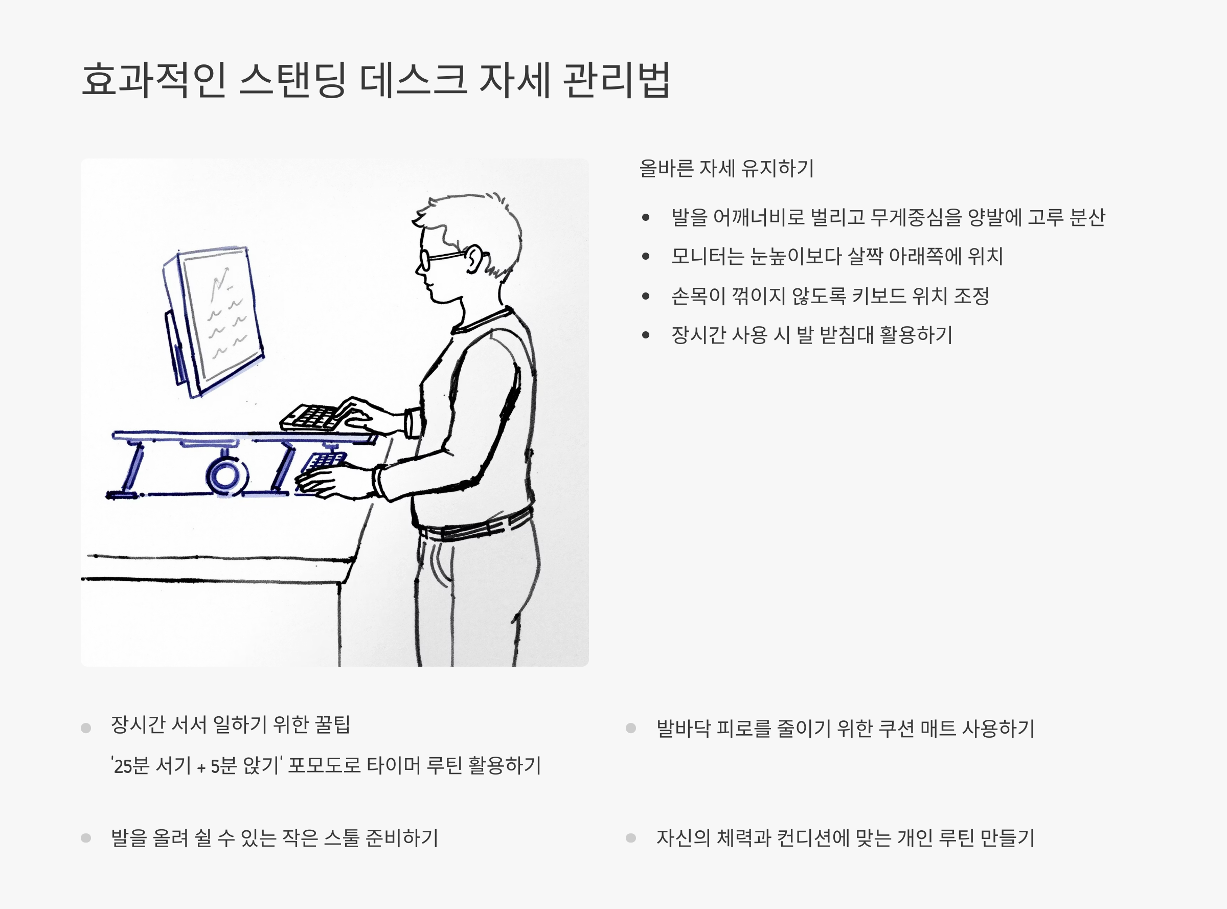 처음엔 단순한 유행이라고 생각했어요. 앉아 있는 시간이 너무 길어져 허리도 아프고, 자꾸 피곤해져서 집중력이 흐트러졌거든요. 그러다 스탠딩 데스크를 알게 되었고, 서서 일하는 방식이 생각보다 효과적이라는 걸 체감하게 됐습니다.