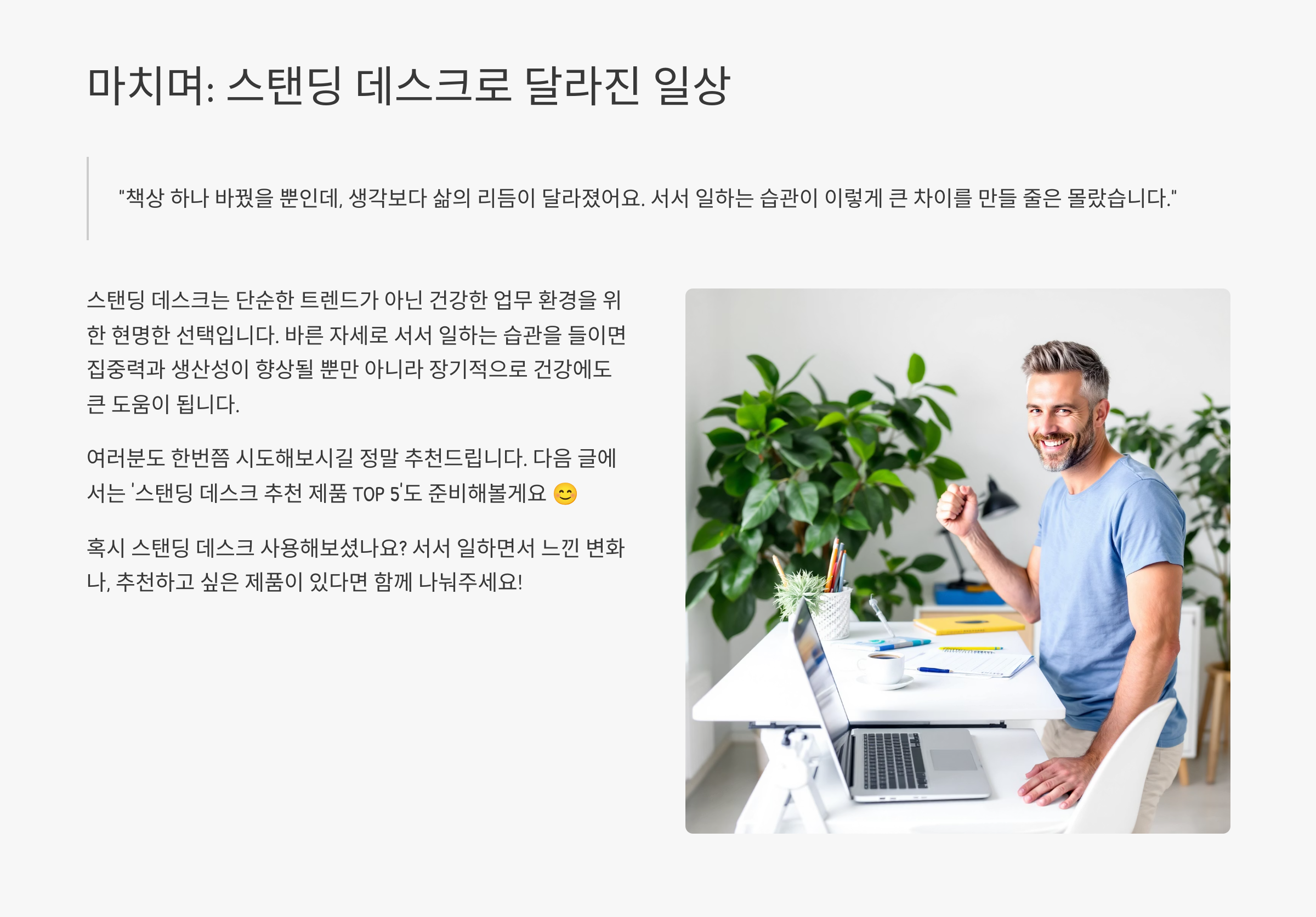 책상 하나 바꿨을 뿐인데, 생각보다 삶의 리듬이 달라졌어요. 서서 일하는 습관이 이렇게 큰 차이를 만들 줄은 몰랐습니다. 여러분도 한번쯤 시도해보시길 정말 추천드릴게요. 다음 글에서는 ‘스탠딩 데스크 추천 제품 TOP 5’도 준비해볼게요 😊