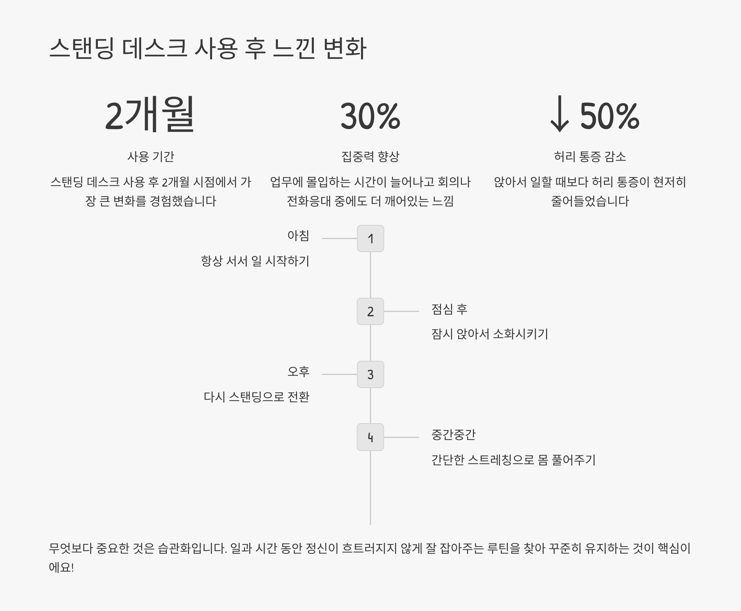 스탠딩 데스크를 사용한 지 두 달쯤 지났을 때, 가장 큰 변화는 '생산성'이었어요. 일에 몰입하는 시간이 더 길어졌고, 회의나 전화응대 중에도 더 깨어있는 느낌이었어요.