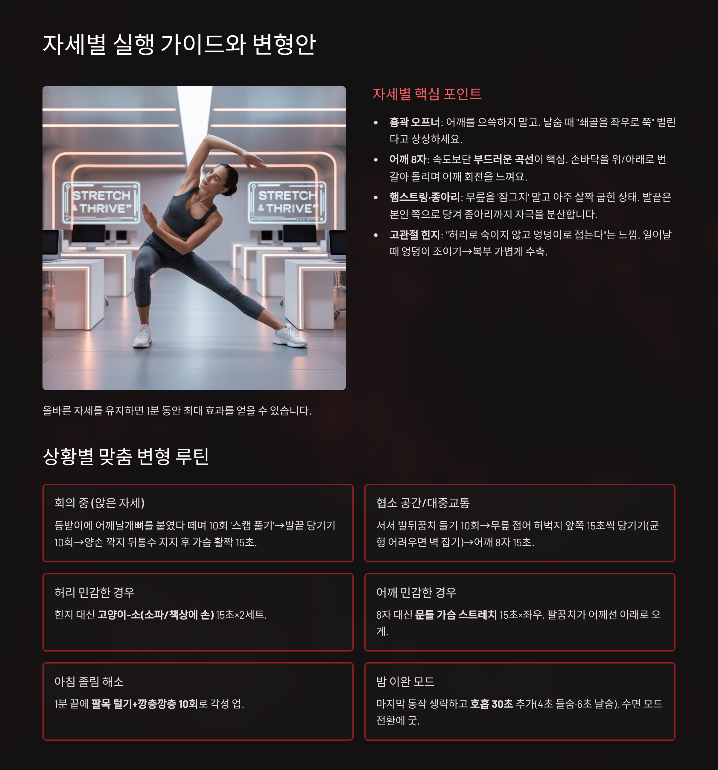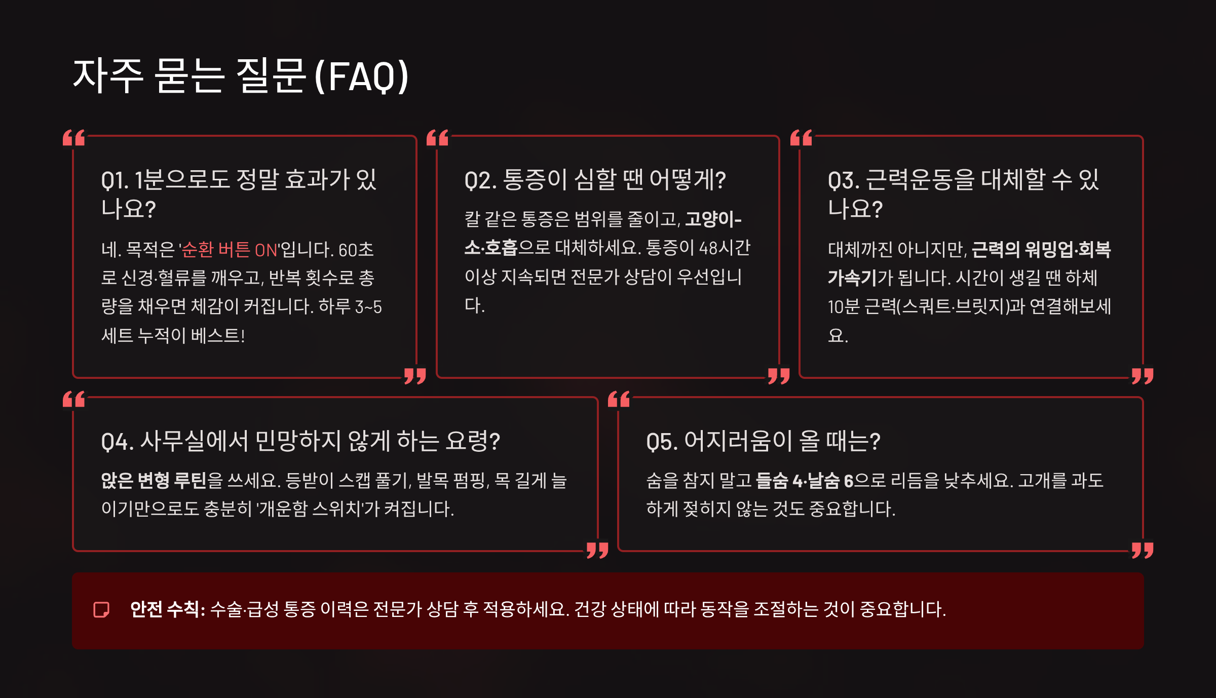 4) 안전수칙: 통증이 날카롭거나 저림이 있으면 즉시 중단, 범위를 줄이거나 대체 동작. 수술·급성 통증 이력은 전문가 상담 후 적용.