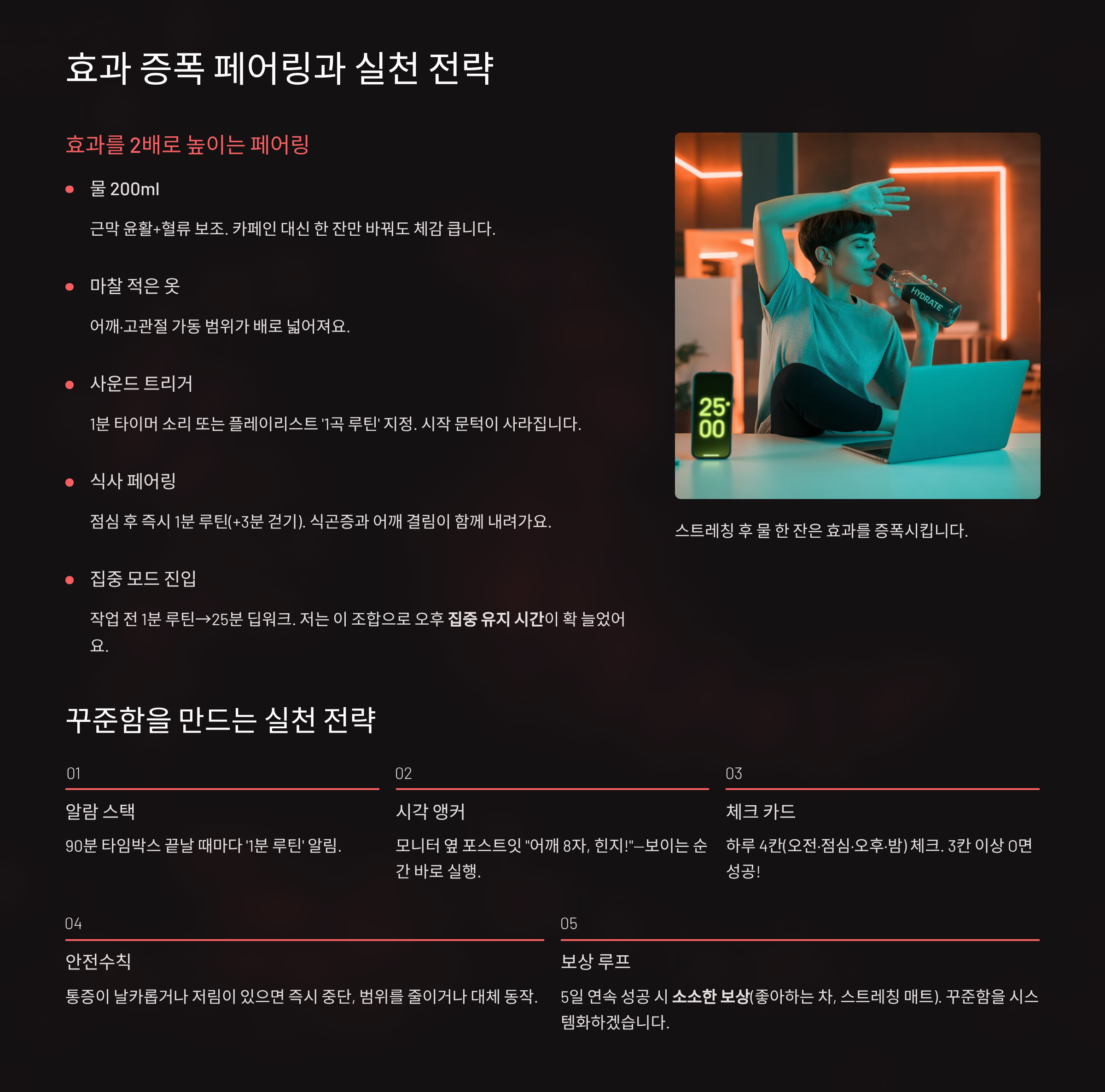 - 식사 페어링: 점심 후 즉시 1분 루틴(+3분 걷기). 식곤증과 어깨 결림이 함께 내려가요.