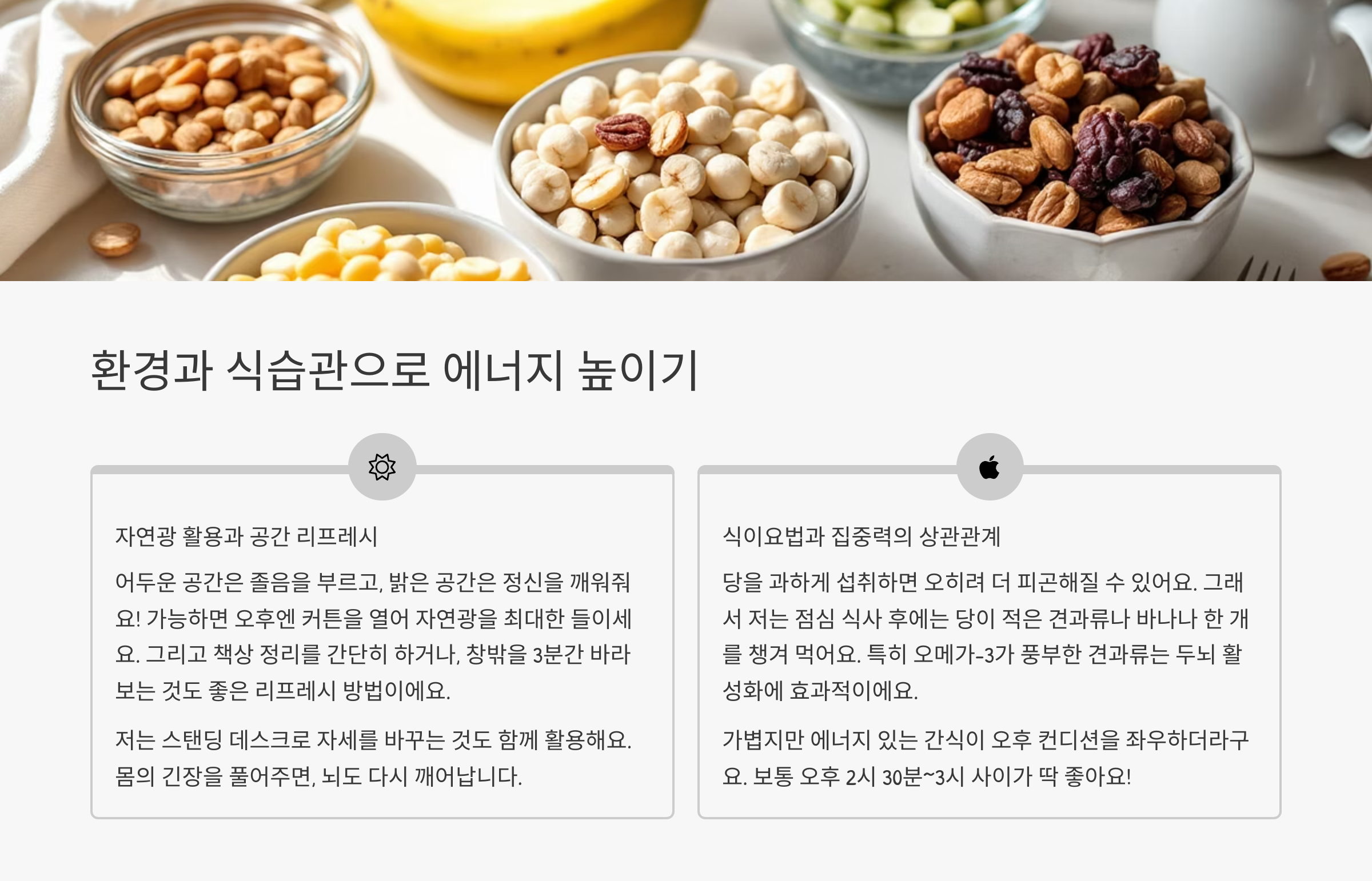 그래서 저는 점심 식사 후에는 당이 적은 견과류나 바나나 한 개를 챙겨 먹어요. 특히 오메가-3가 풍부한 견과류는 두뇌 활성화에 효과적이에요.