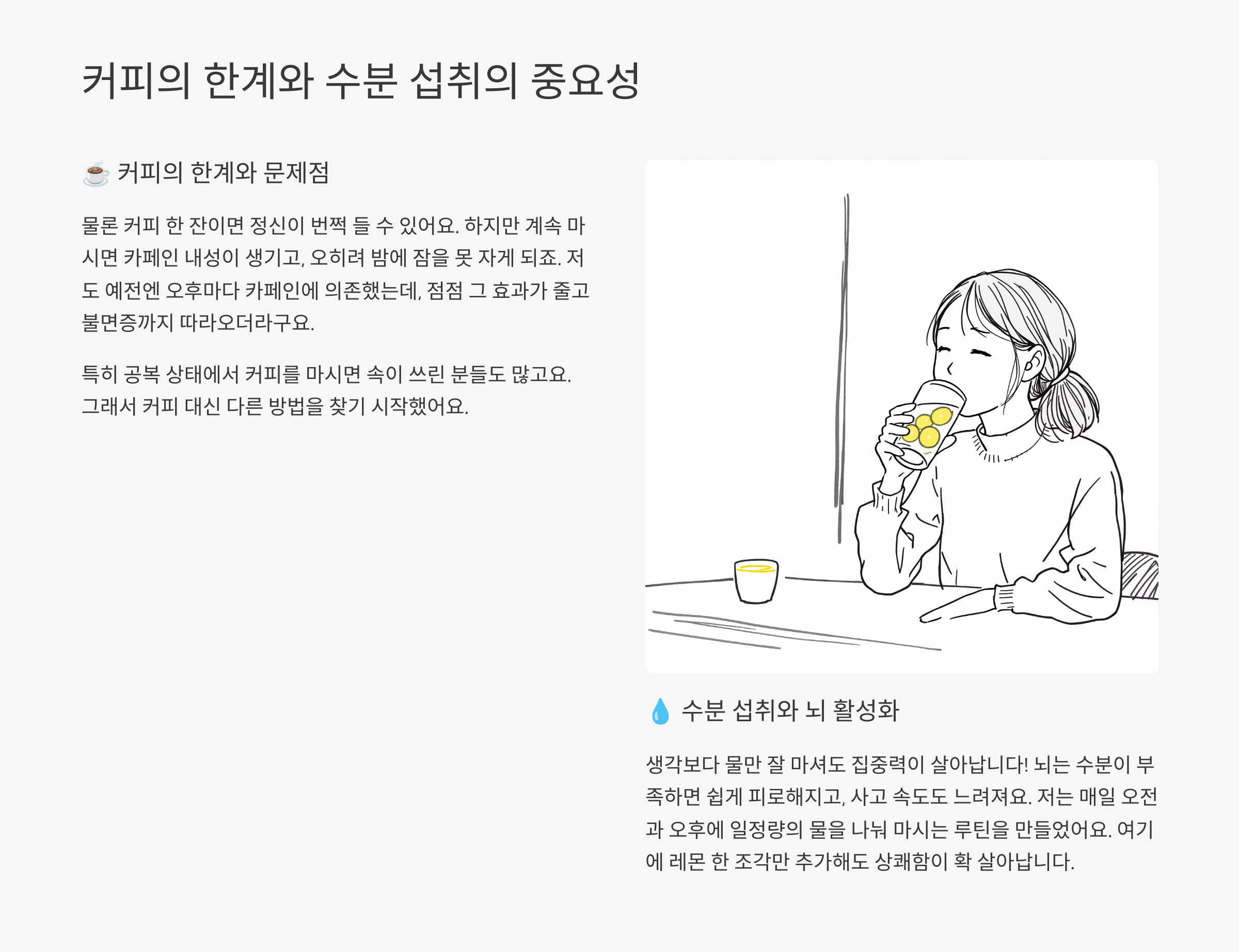 커피 대신 활용해본 특별한 팁이나, 효과 본 루틴이 있다면 댓글로 함께 나눠주세요!
