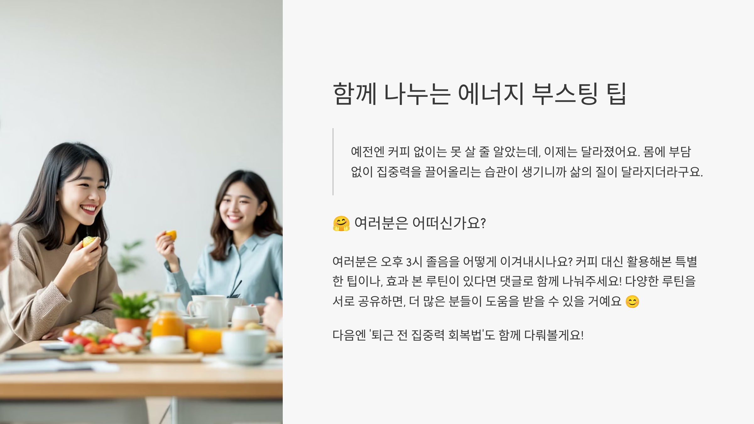 예전엔 커피 없이는 못 살 줄 알았는데, 이제는 달라졌어요. 몸에 부담 없이 집중력을 끌어올리는 습관이 생기니까 삶의 질이 달라지더라구요. 다음엔 ‘퇴근 전 집중력 회복법’도 함께 다뤄볼게요!