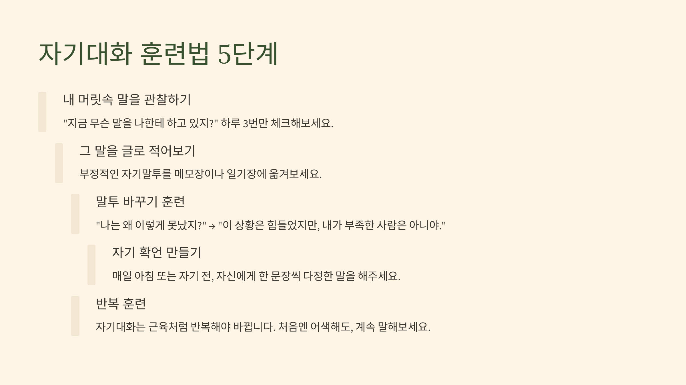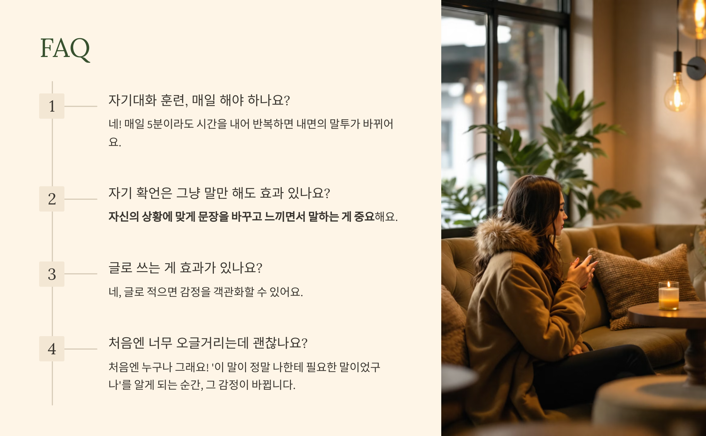 네! 매일 5분이라도 시간을 내어 반복하면 내면의 말투가 바뀌어요.