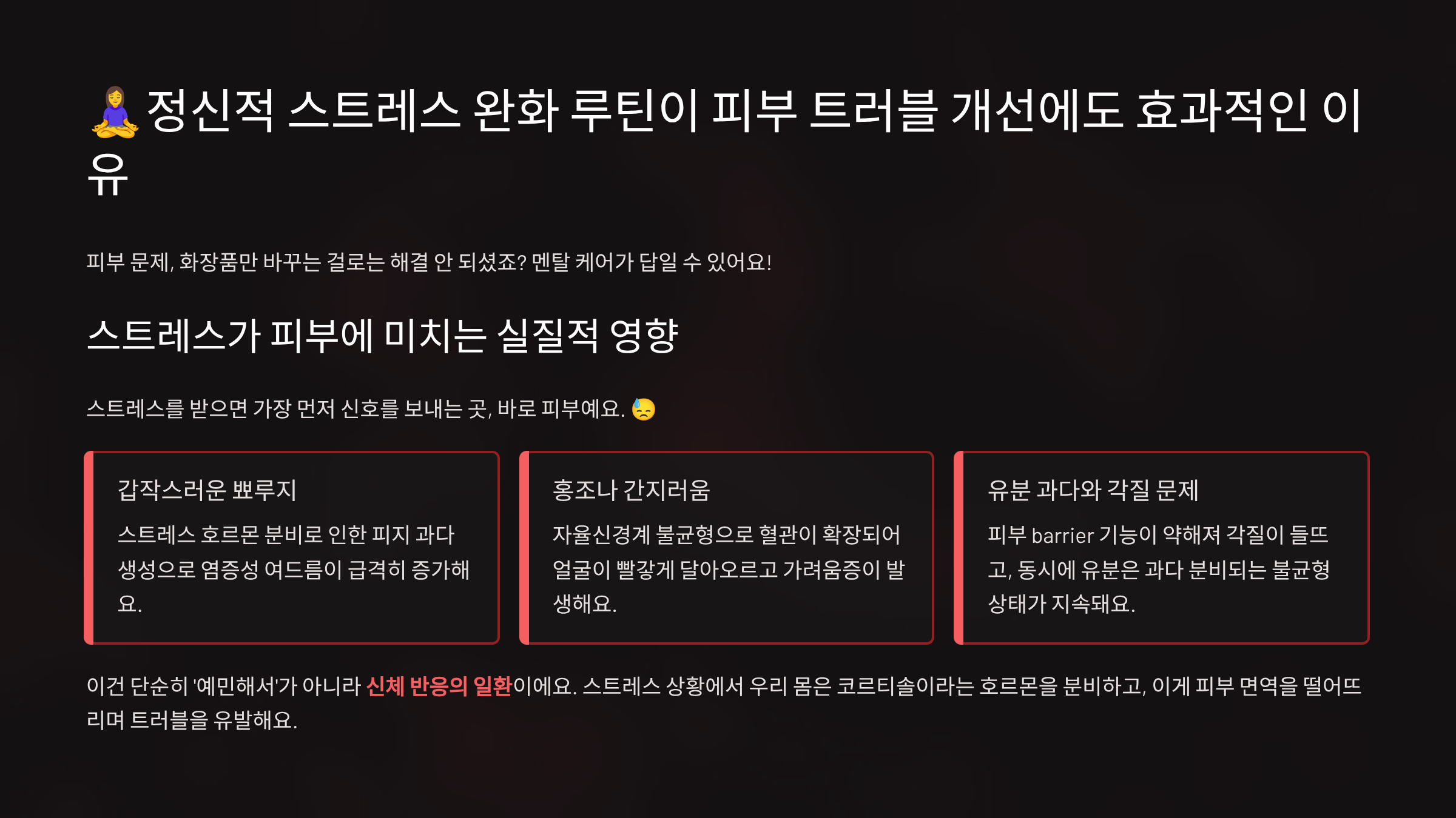 태그: 스트레스와피부, 피부트러블, 멘탈케어, 정신건강루틴, 피부염관리, 트러블완화, 코르티솔, 피부관리습관, 감정루틴, 명상스킨케어