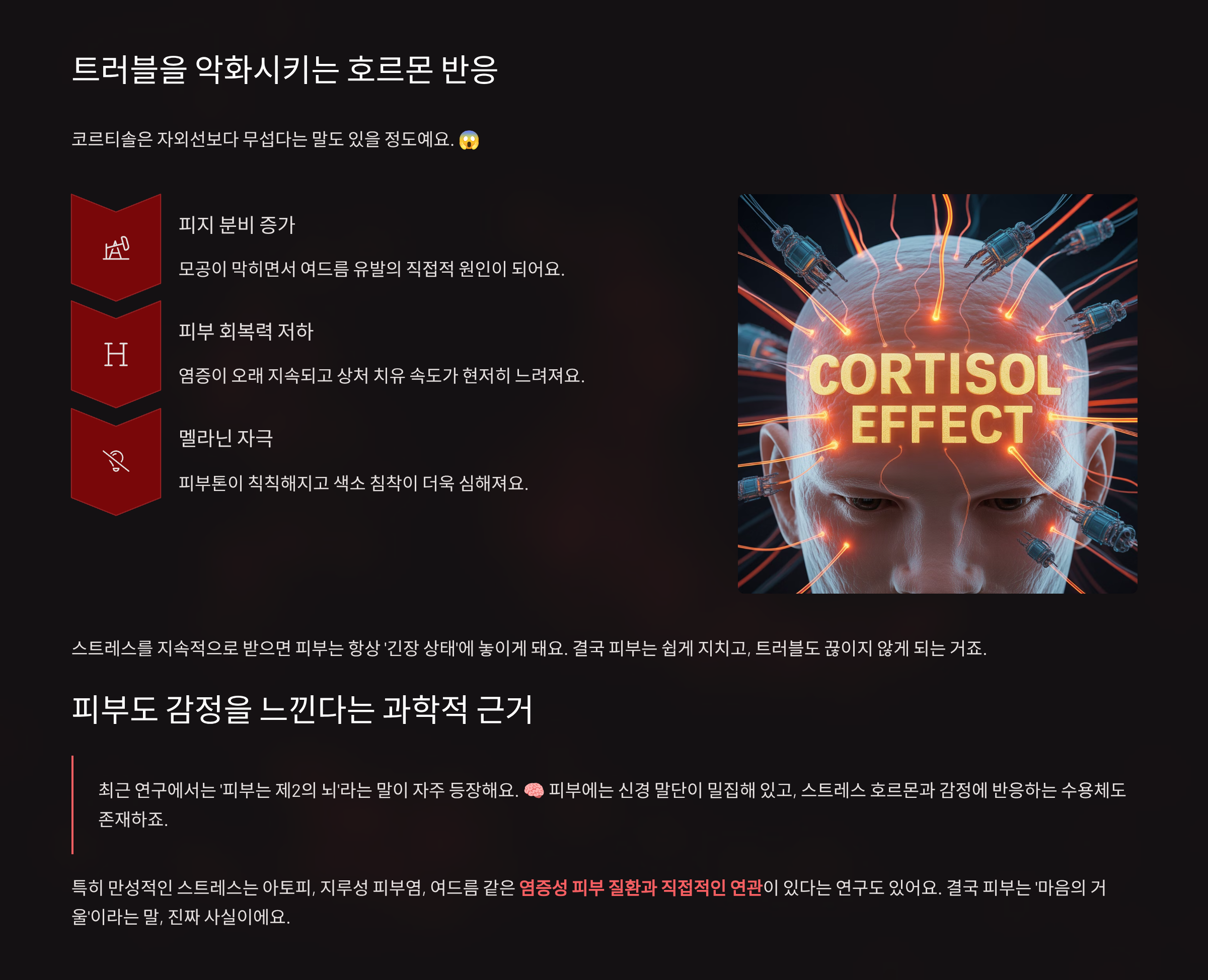 스트레스 상황에서 우리 몸은 코르티솔이라는 호르몬을 분비하고, 이게 피부 면역을 떨어뜨리며 트러블을 유발해요.