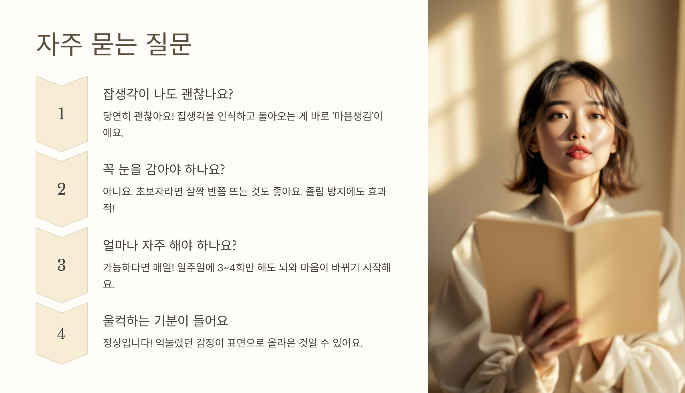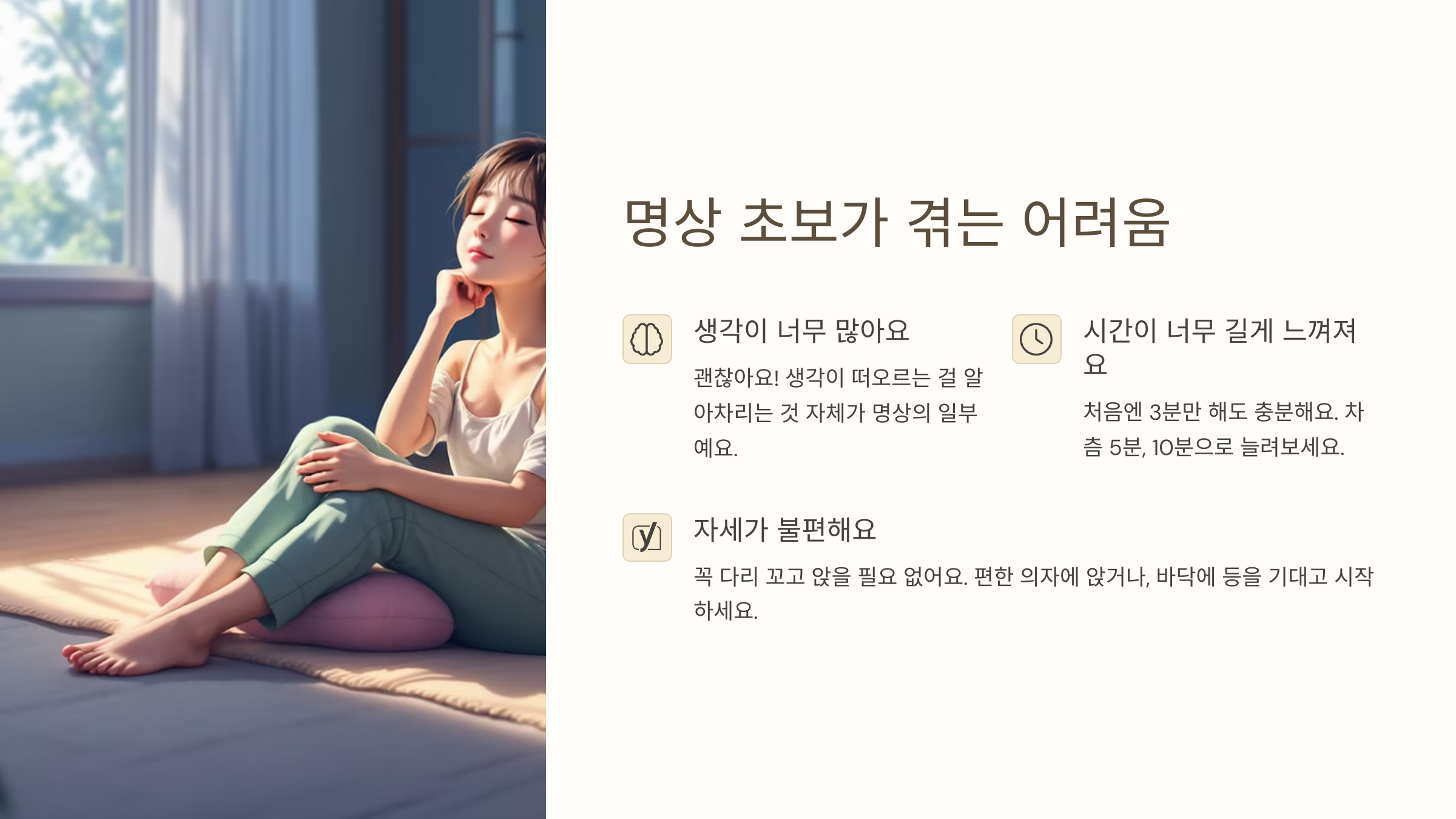 저처럼 처음 명상을 시작한 분들이 가장 흔하게 겪는 벽, 바로 이 3가지입니다: