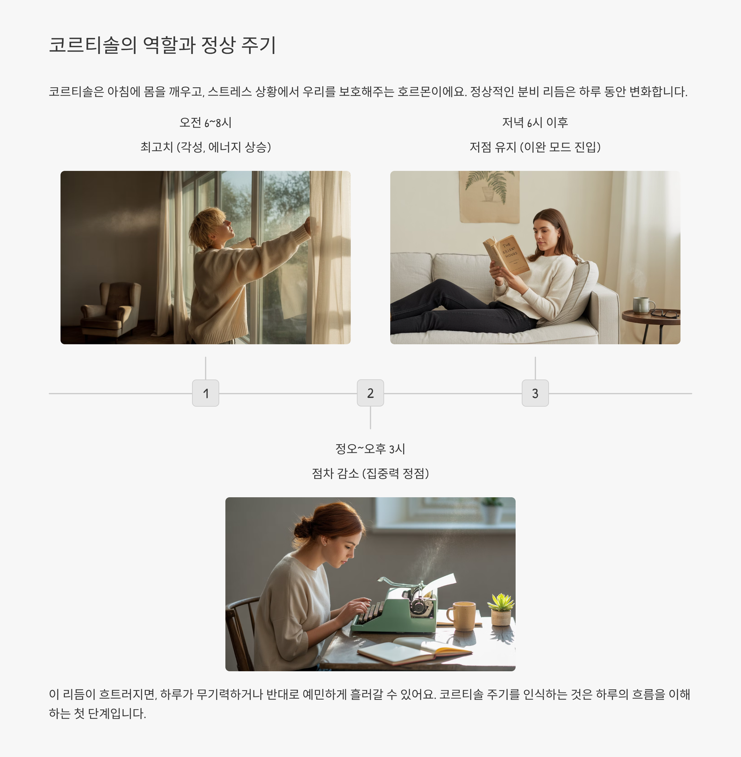 그 원인이 단순한 스트레스가 아니라 ‘코르티솔 리듬’ 때문이란 걸 알고 나서 루틴을 바꾸게 됐어요.