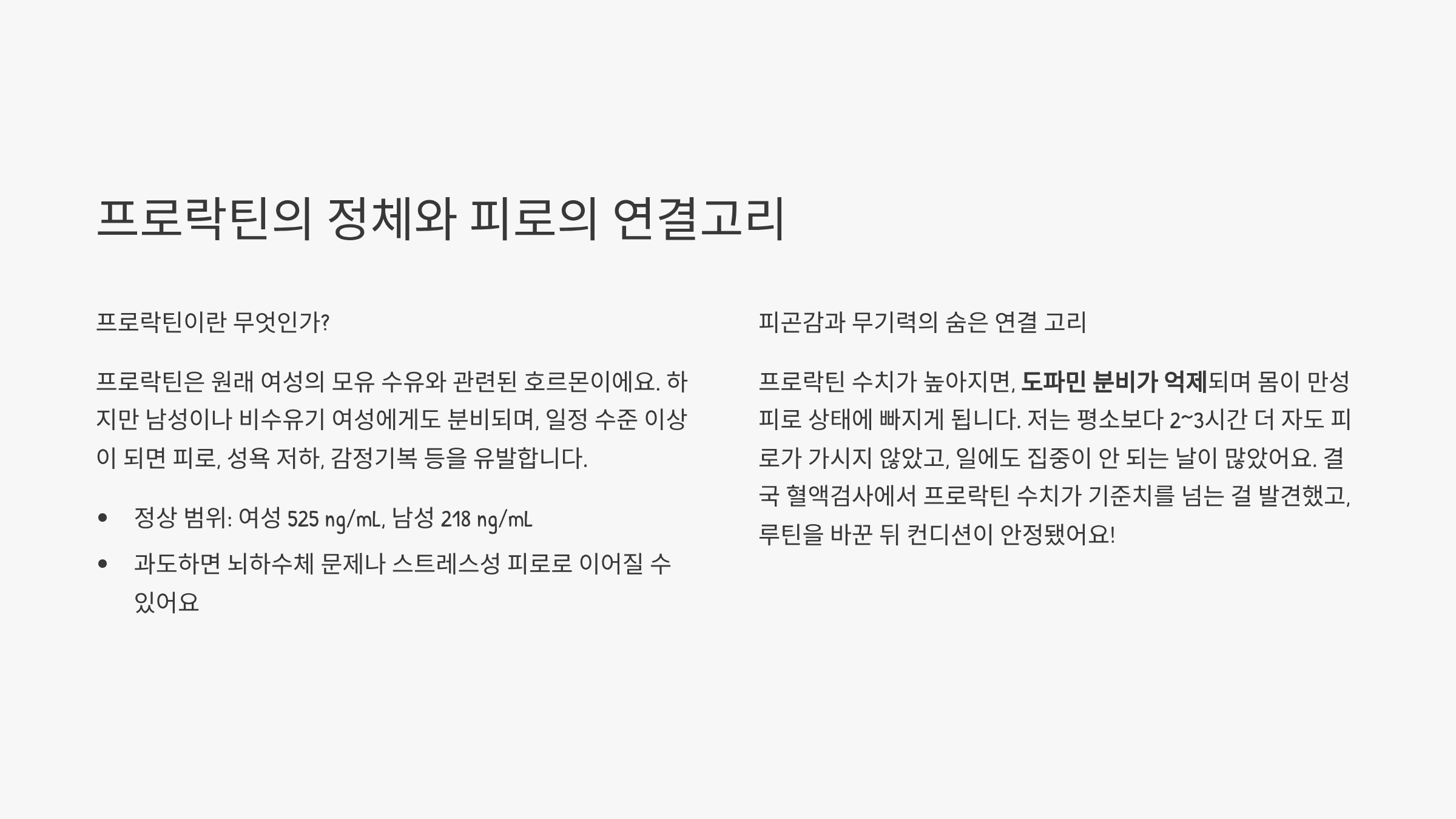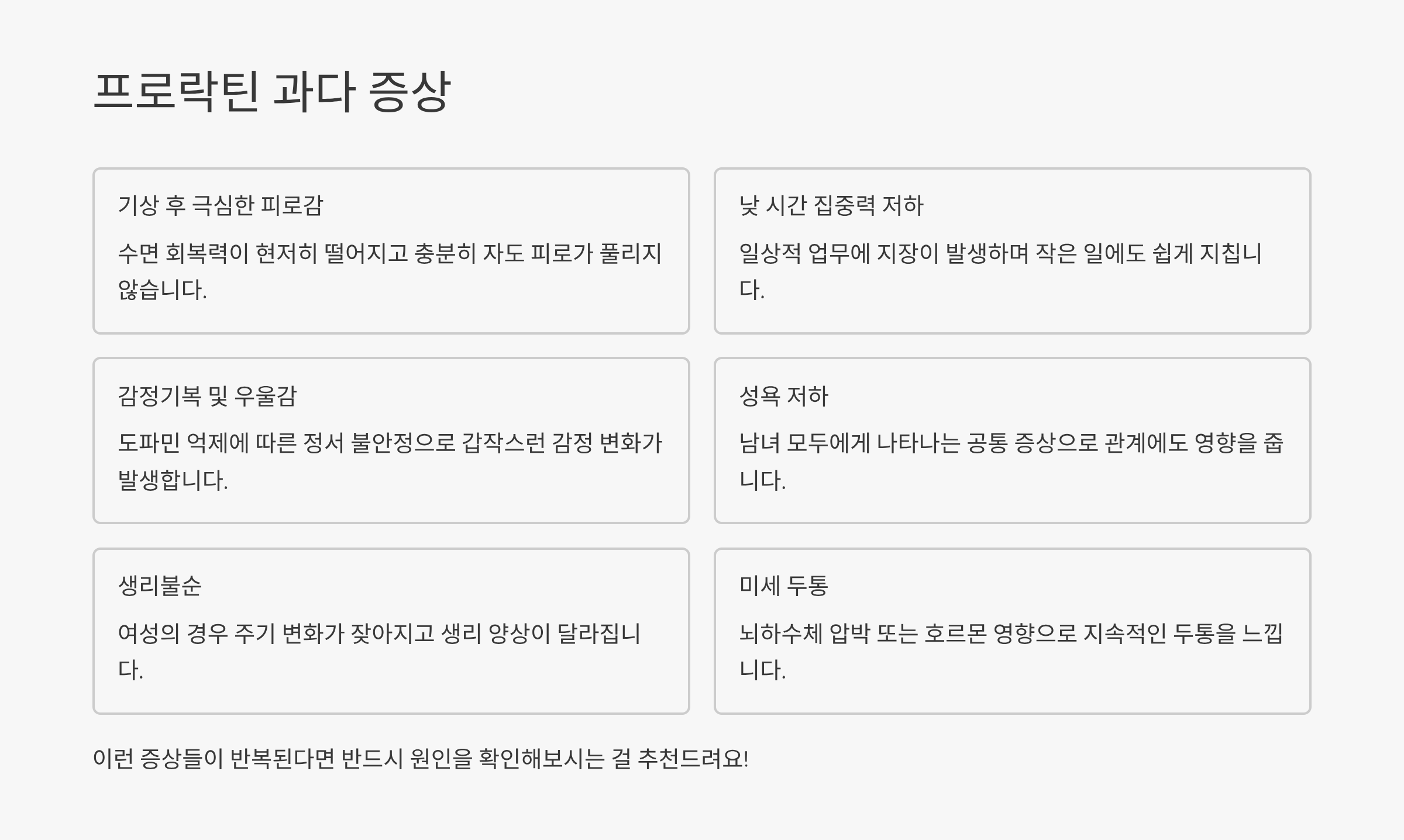하지만 남성이나 비수유기 여성에게도 분비되며, 일정 수준 이상이 되면 피로, 성욕 저하, 감정기복 등을 유발합니다.