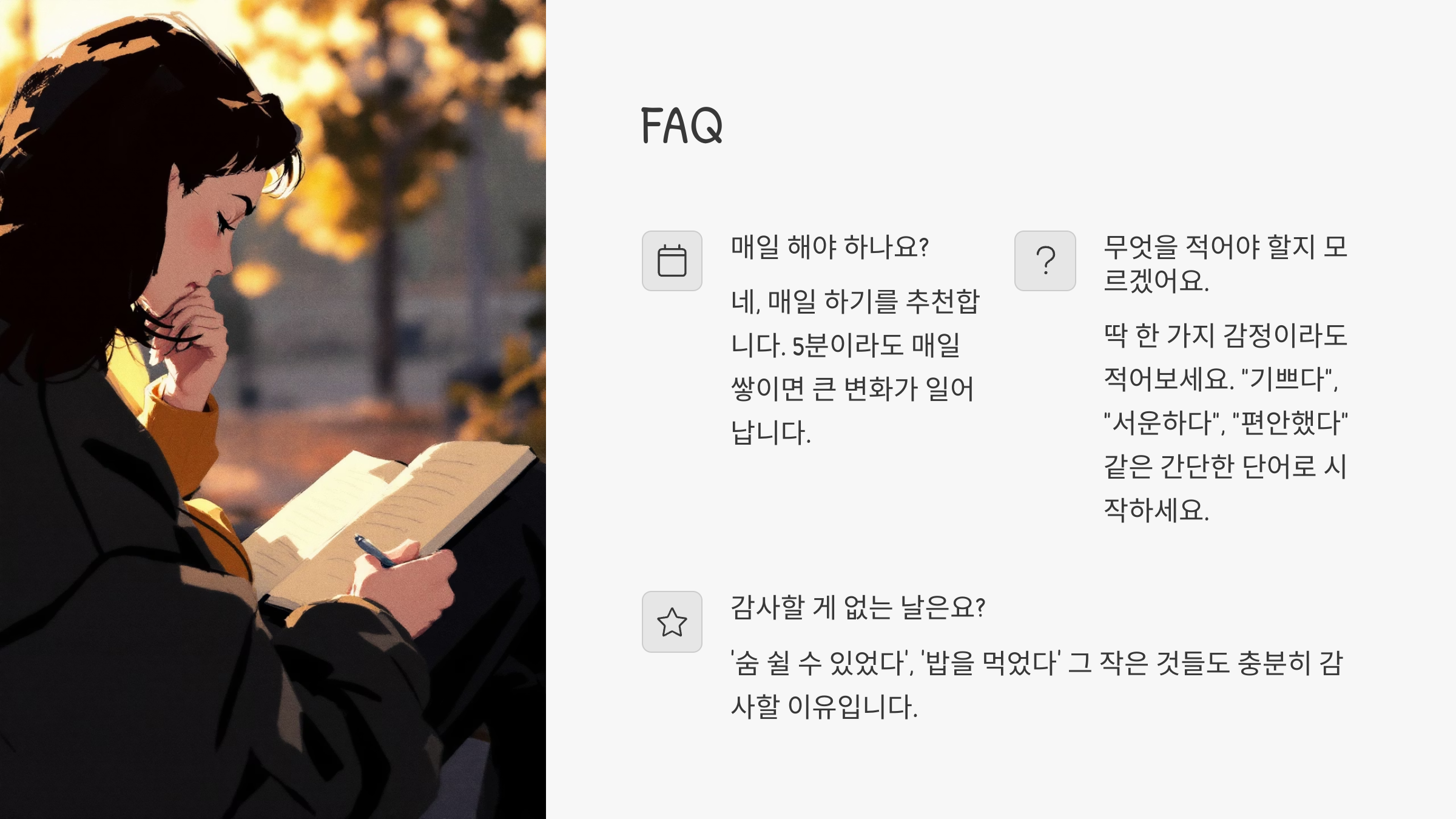 "기쁘다", "서운하다", "편안했다" 같은 간단한 단어로 시작하세요.