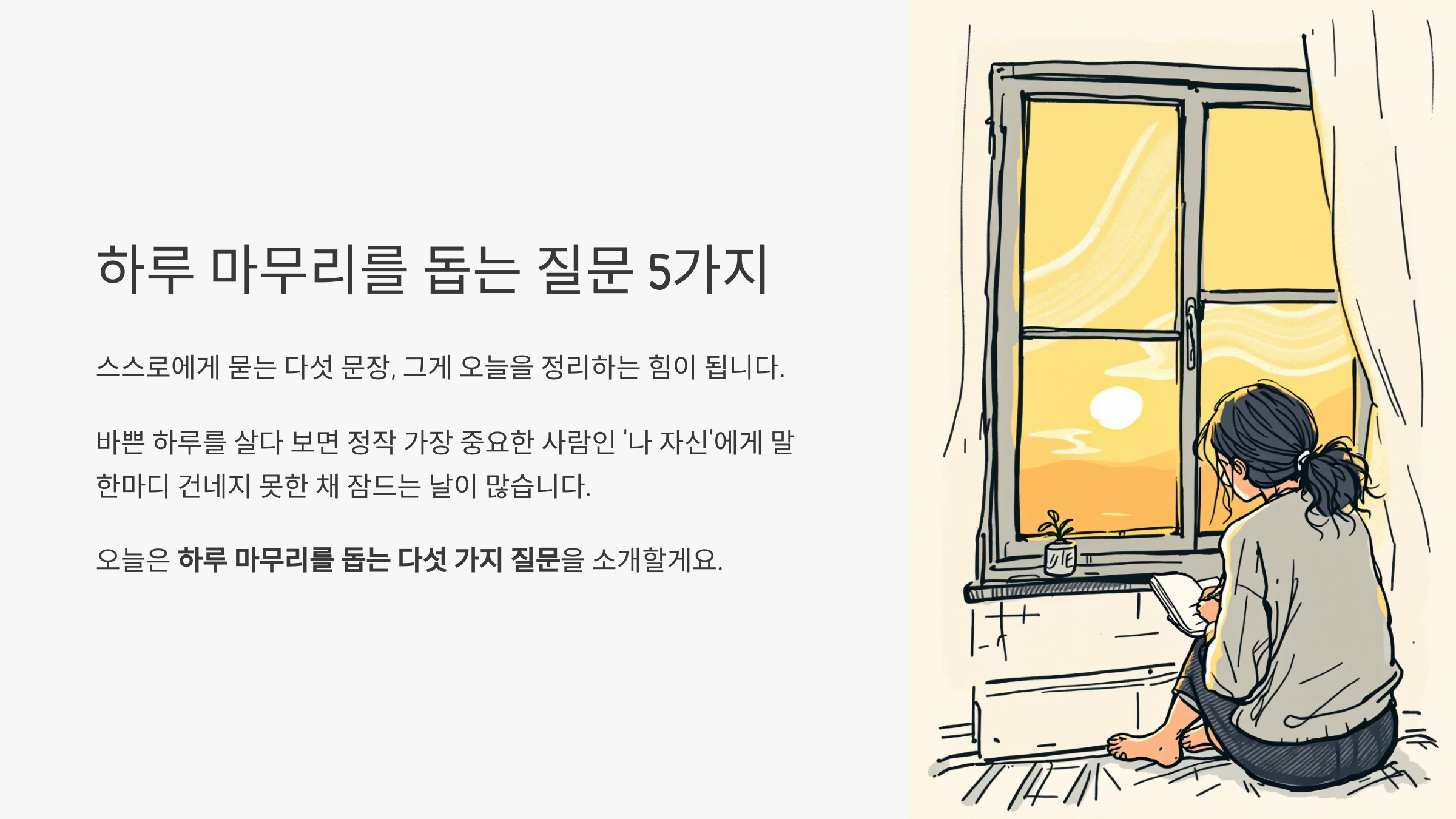 오늘은 하루 마무리를 돕는 다섯 가지 질문을 소개할게요.