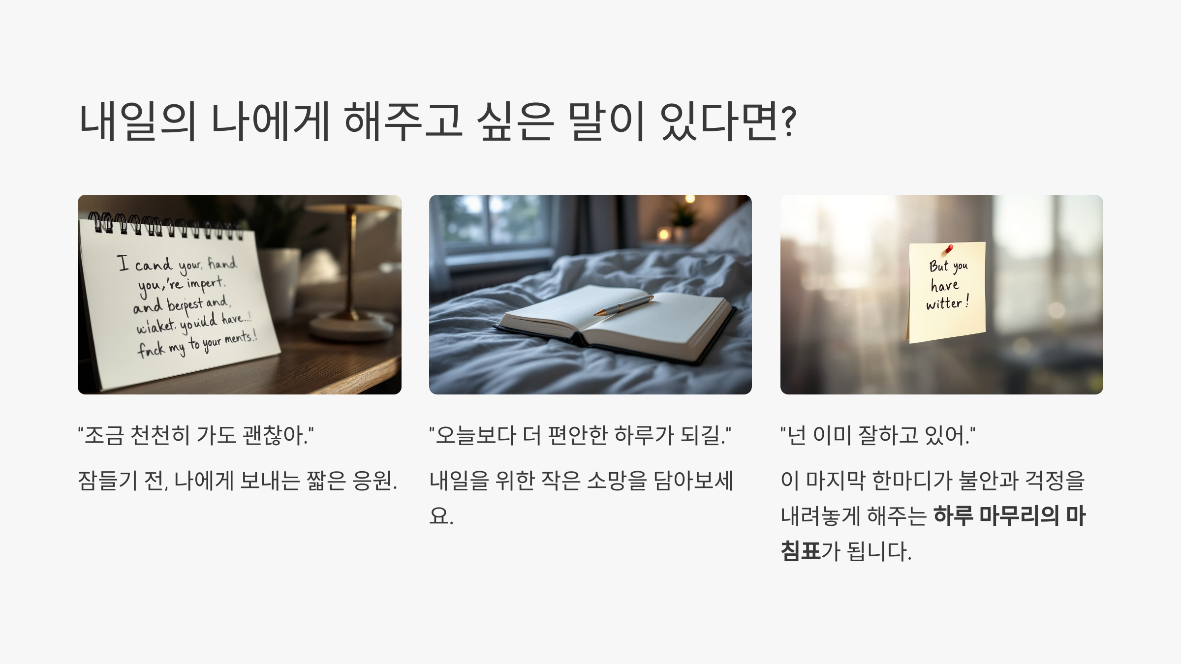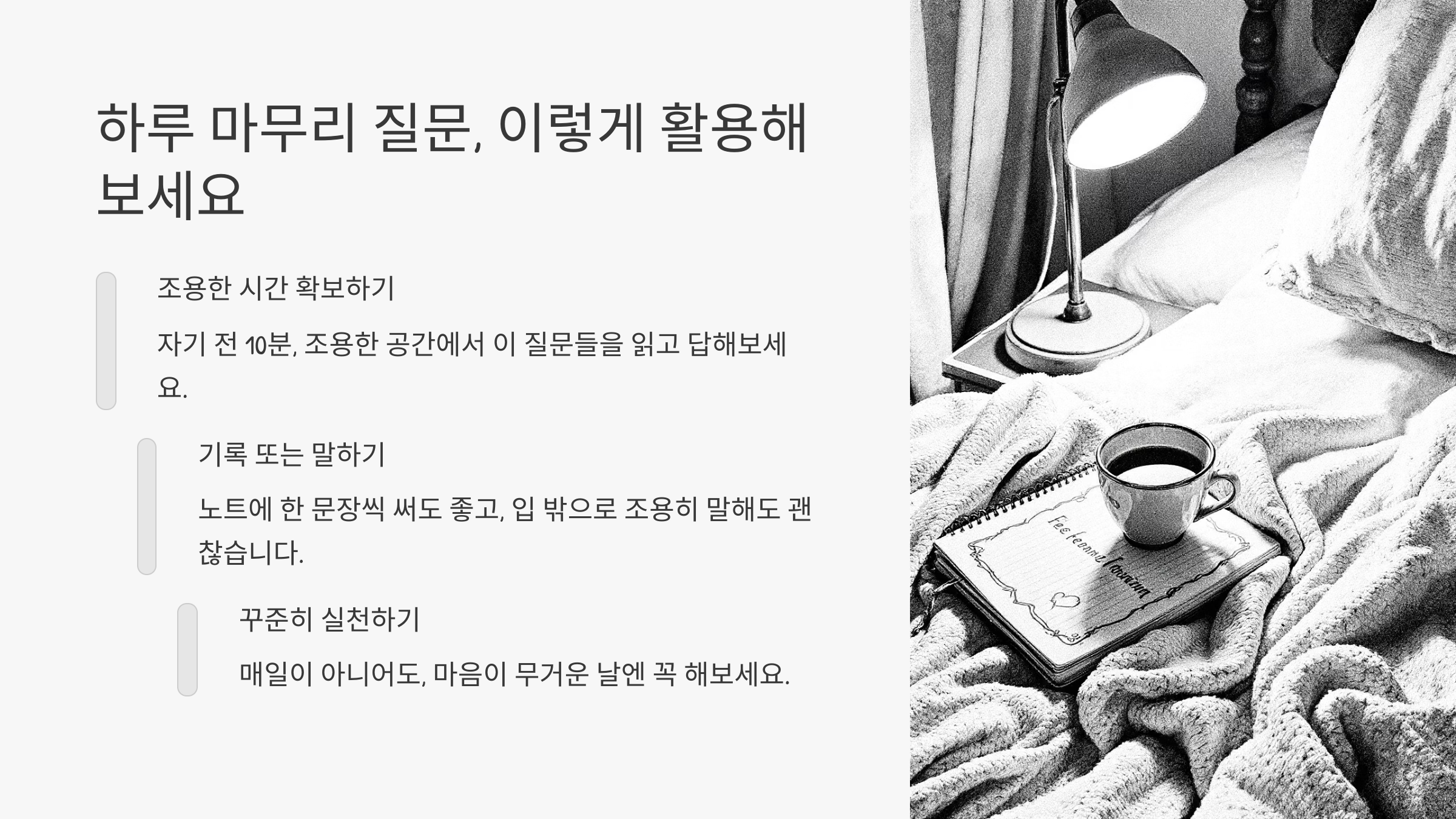 - 자기 전 10분, 조용한 공간에서 이 질문들을 읽고 답해보세요.