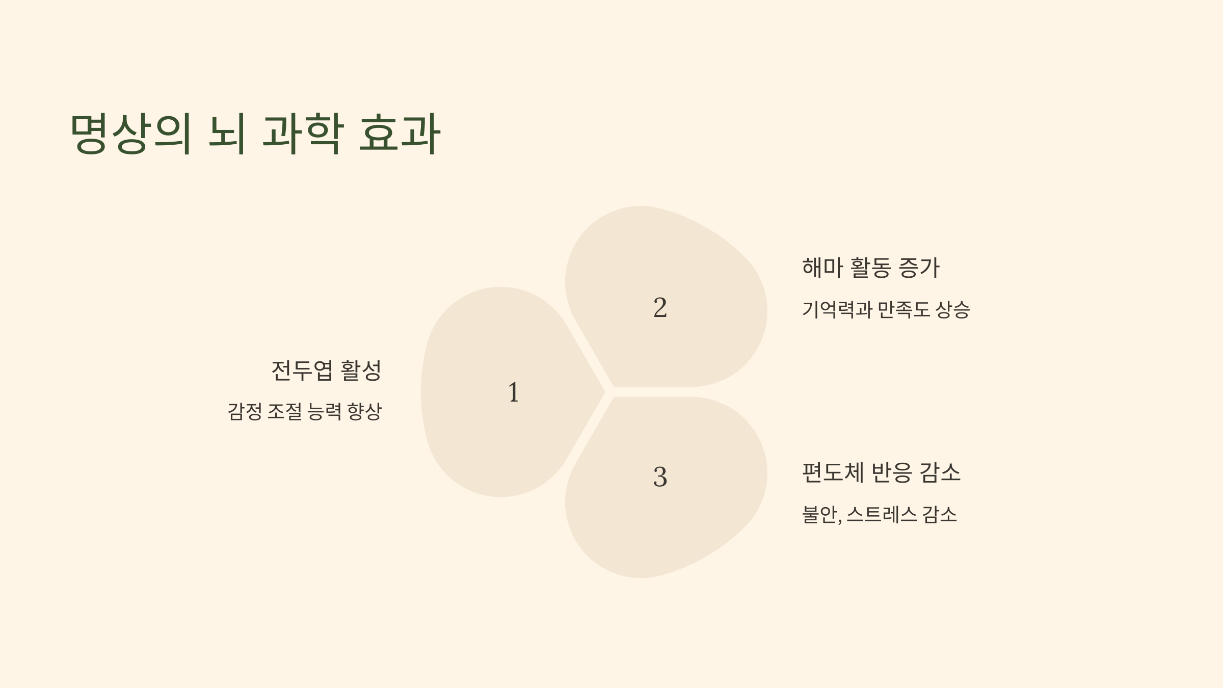 명상을 하면 뇌에서 전두엽과 해마의 활동이 증가하고, 편도체의 반응성은 줄어든다고 해요. 쉽게 말해, 감정을 더 잘 조절할 수 있게 되고, 스트레스 반응이 줄어드는 거죠.