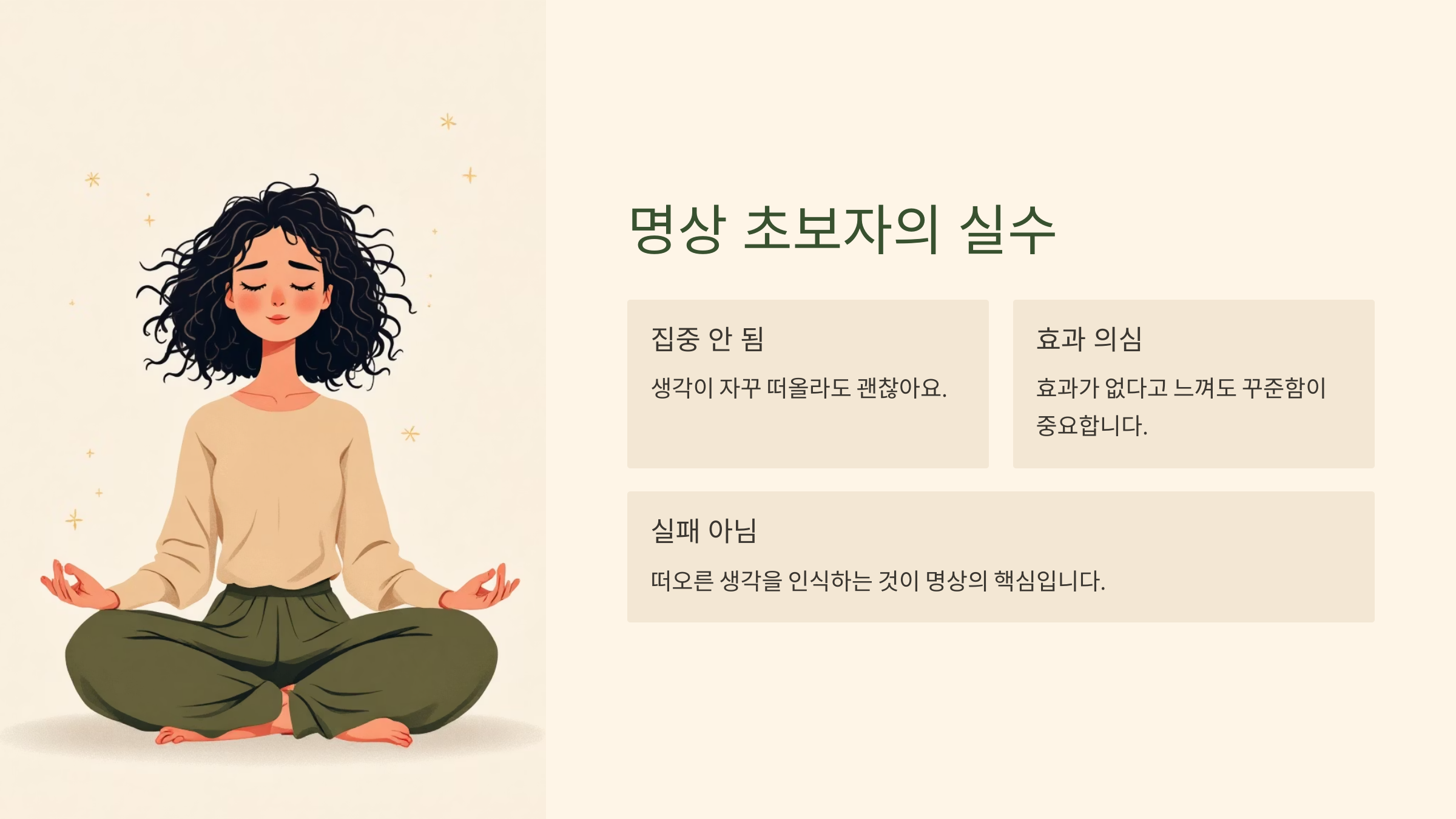 저도 똑같았어요. 하지만 이건 ‘실패’가 아니라 ‘명상을 하고 있다는 증거’예요. 떠오른 생각을 인식하고 다시 돌아오는 게 핵심이거든요. 중요한 건 꾸준함! 매일 10분을 투자하면, 어느새 ‘아, 지금 감정이 올라오고 있구나’ 하는 인식력이 생겨요. 그게 진짜 마음챙김이에요.