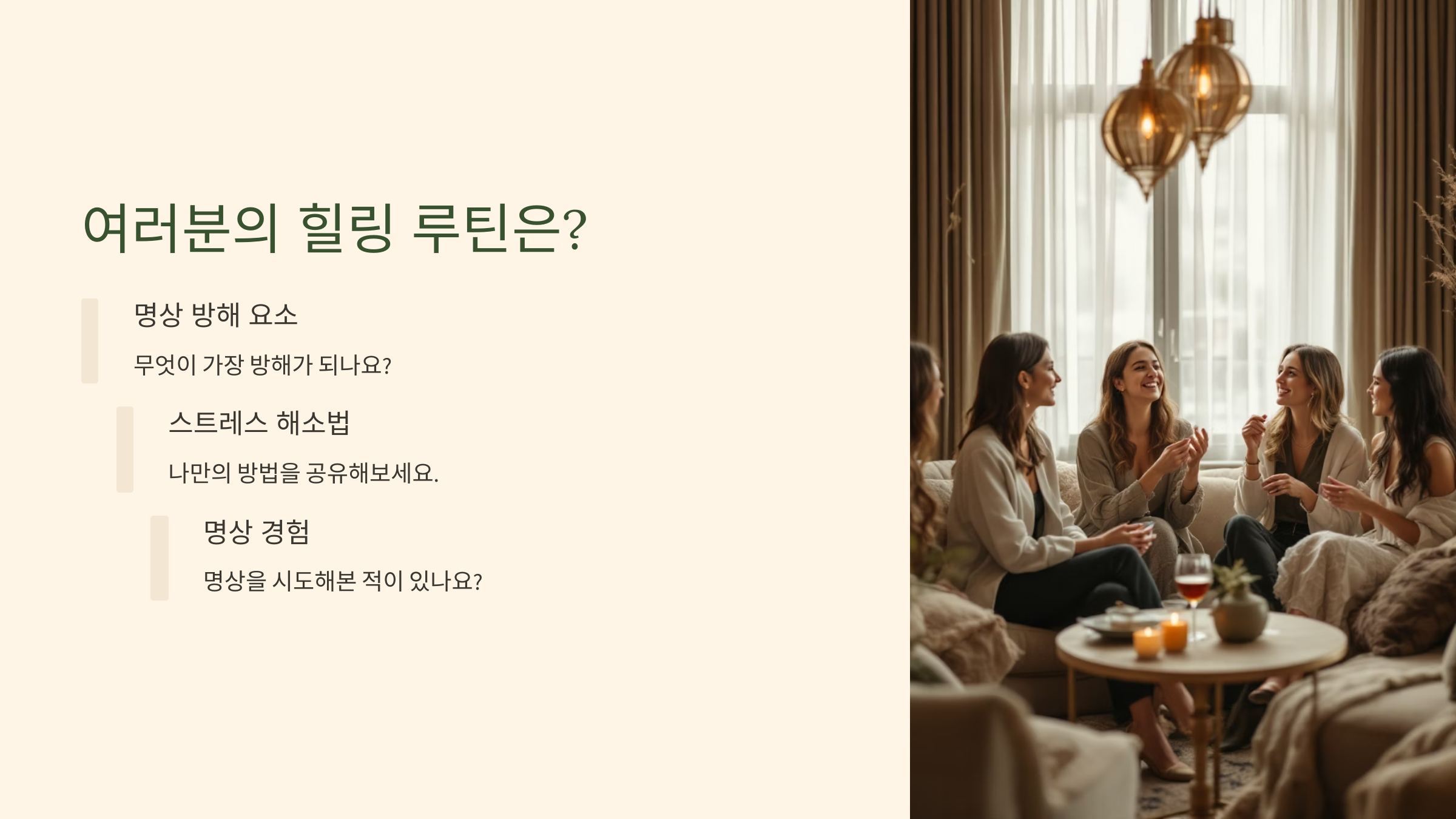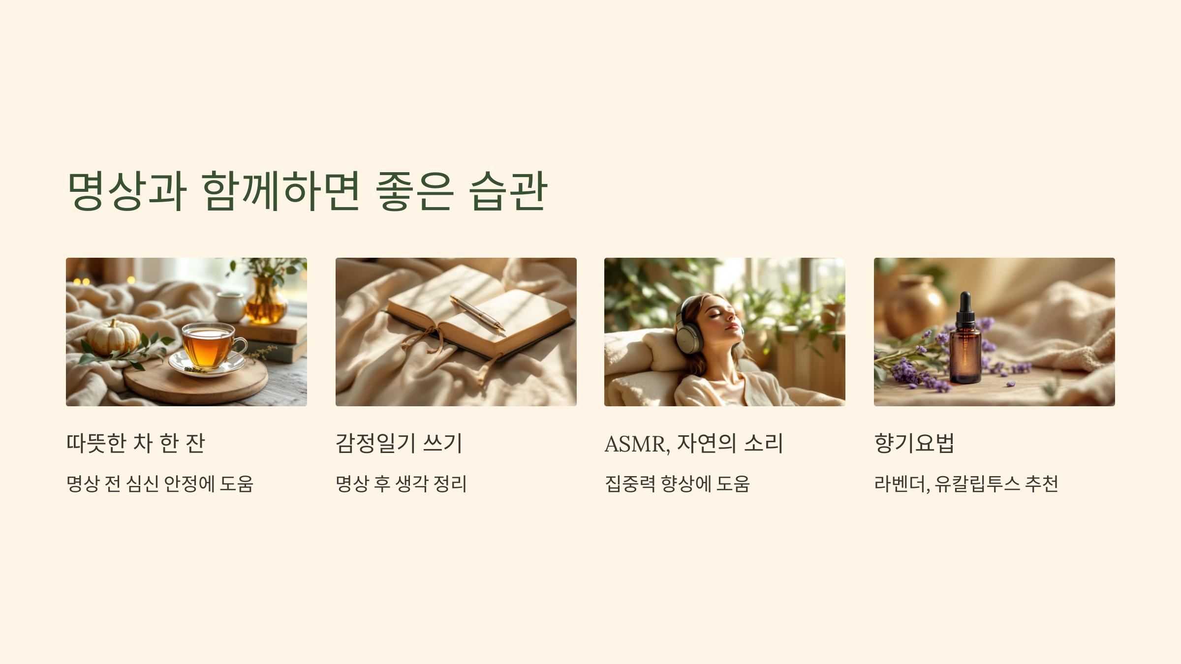 명상 효과를 극대화하고 싶다면, 아래 루틴과 함께해보세요: