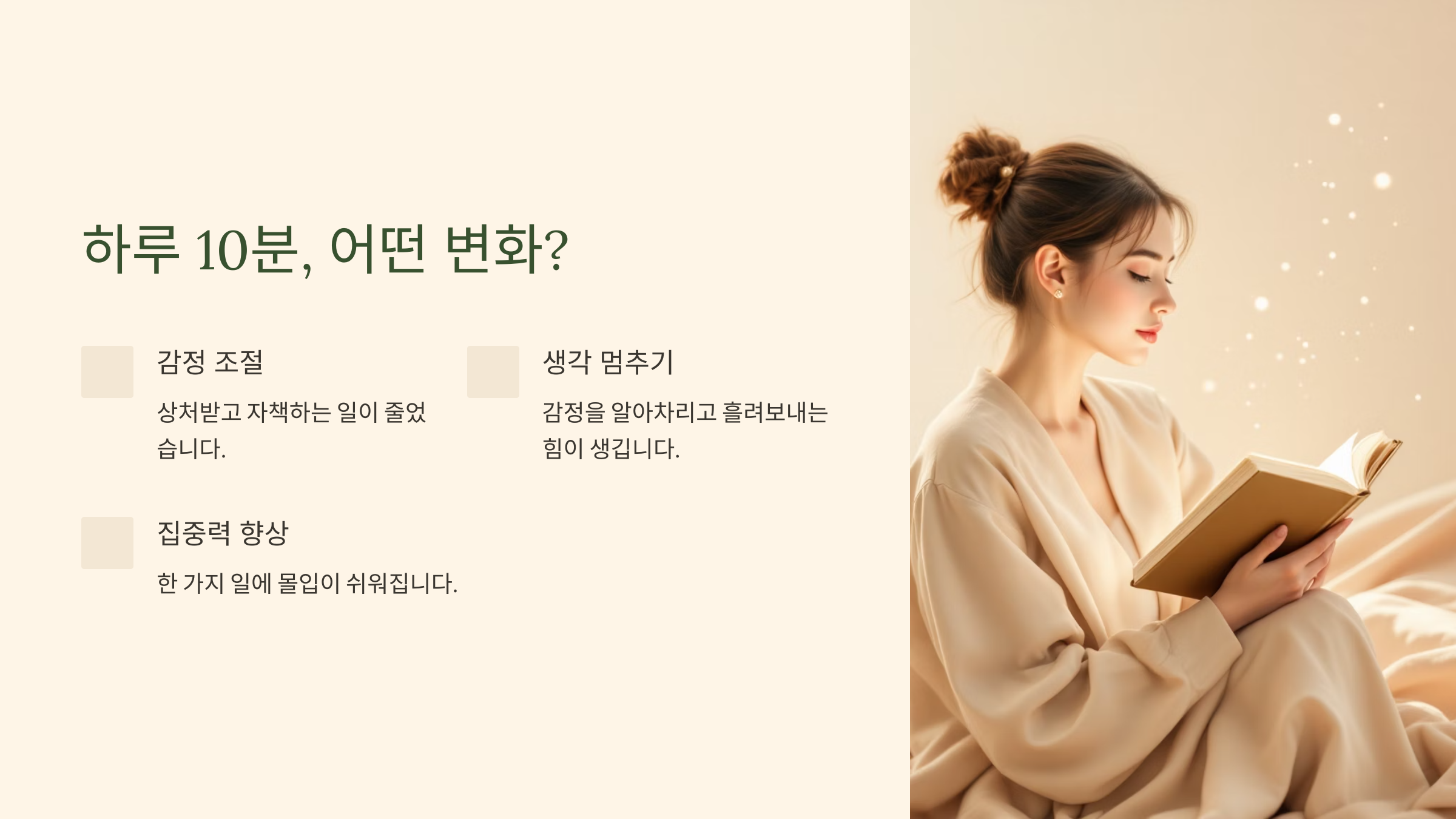 하루 10분이라는 시간, 처음엔 별것 아닌 것 같았지만 지금은 제 일상에서 가장 소중한 시간이 되었어요.