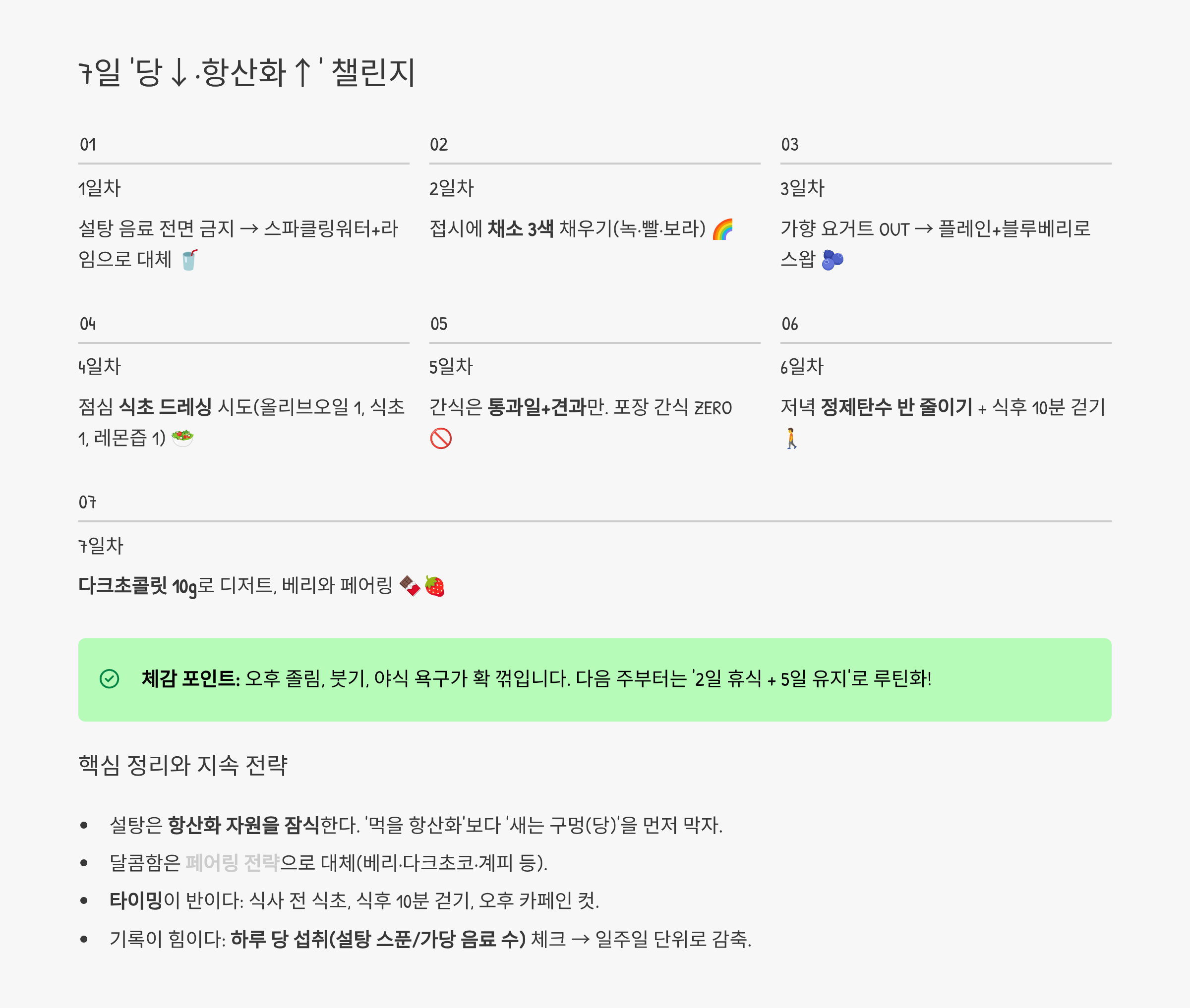→ 체감 포인트: 오후 졸림, 붓기, 야식 욕구가 확 꺾입니다. 다음 주부터는 ‘2일 휴식 + 5일 유지’로 루틴화!