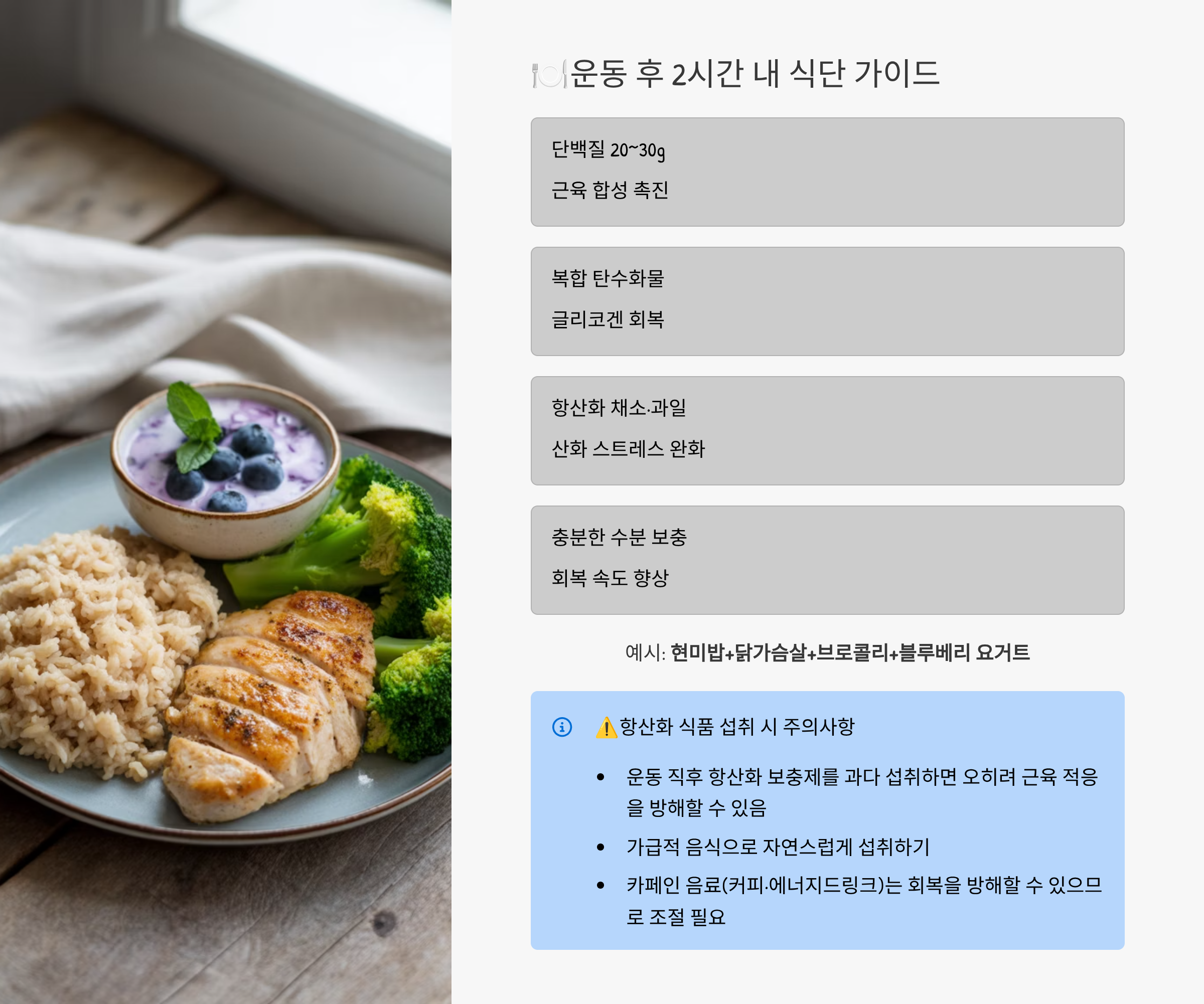 운동 후 회복은 ‘휴식+영양’ 두 축이 맞아야 완성됩니다.