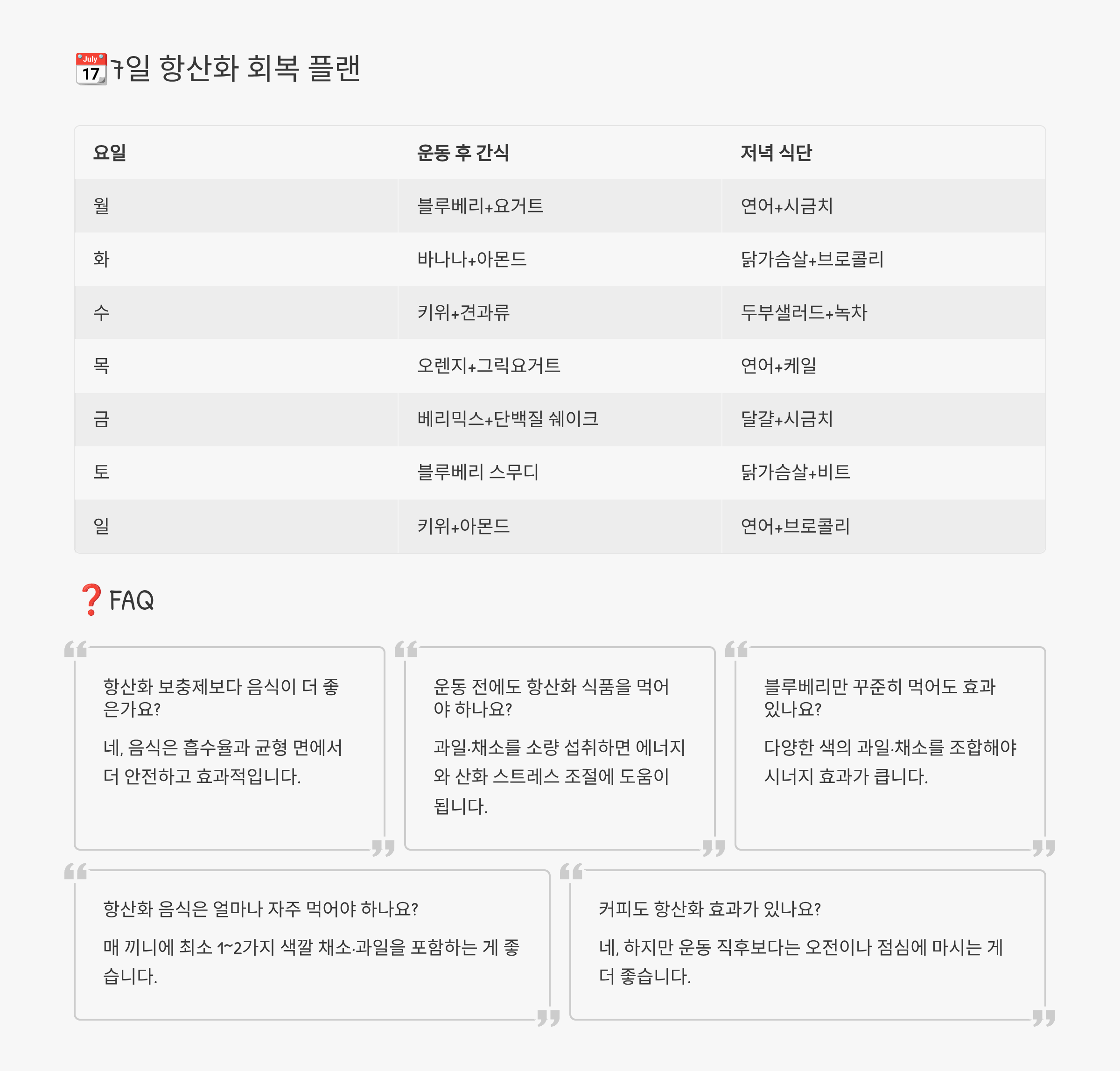 저는 운동 후 항산화 식품을 조합해서 먹으면서 근육통이 줄고 회복 속도가 확실히 빨라졌어요.