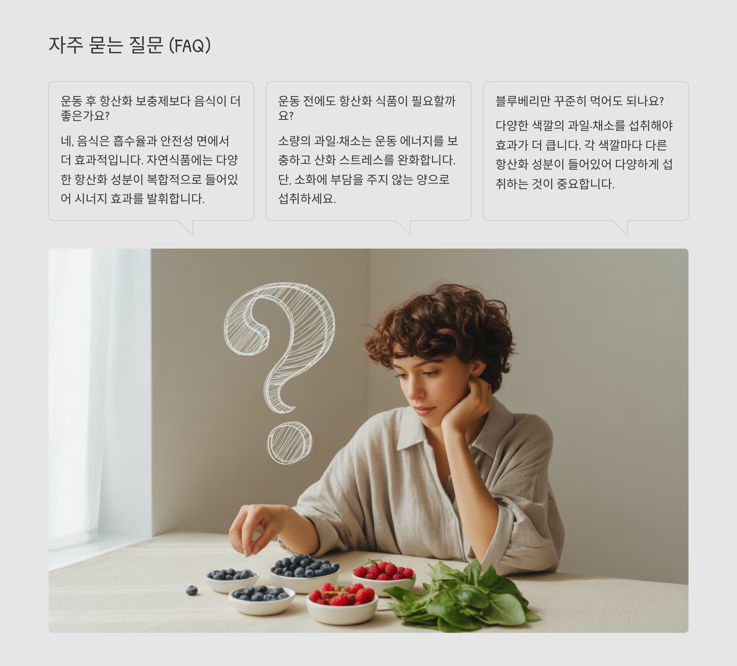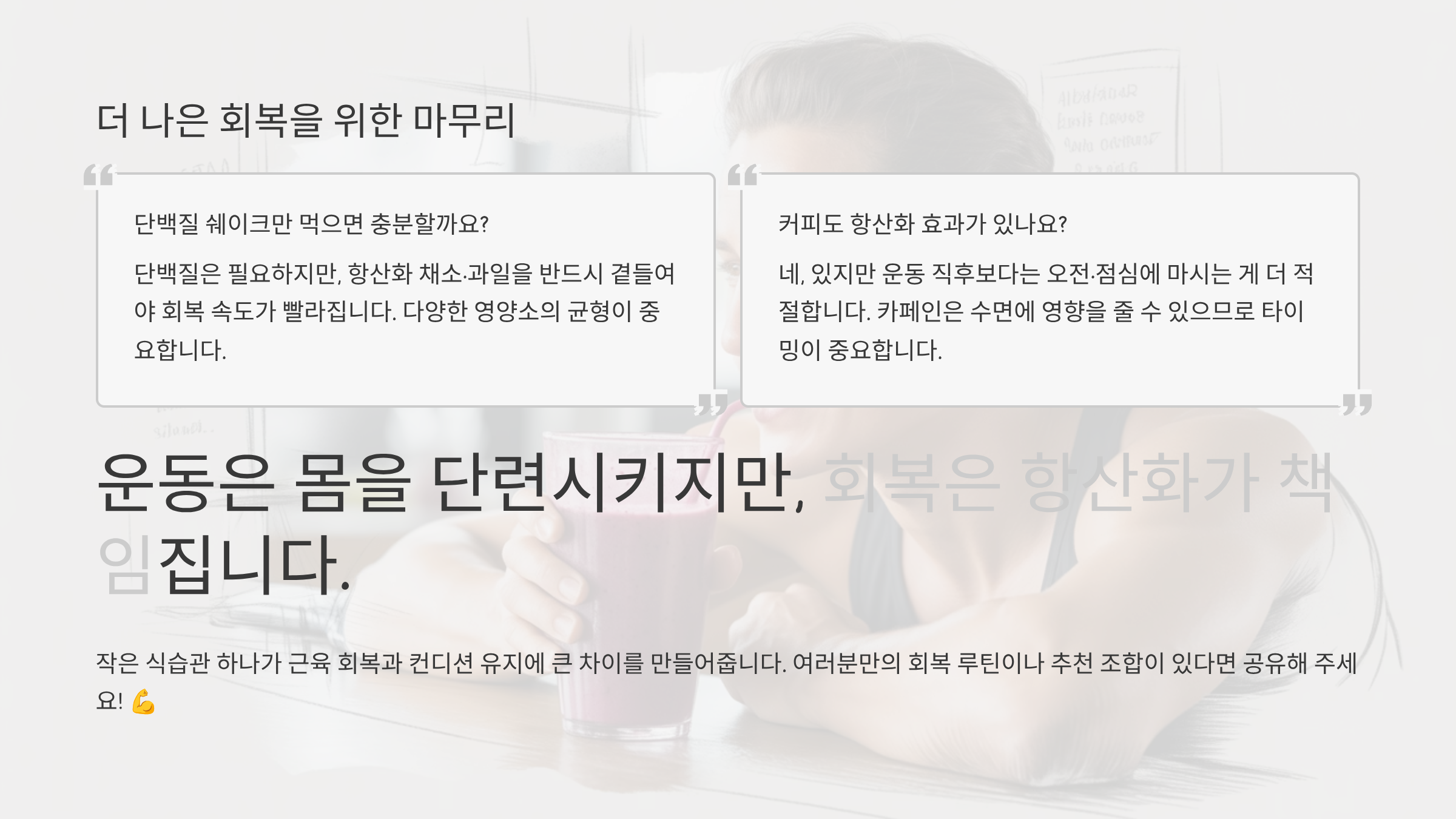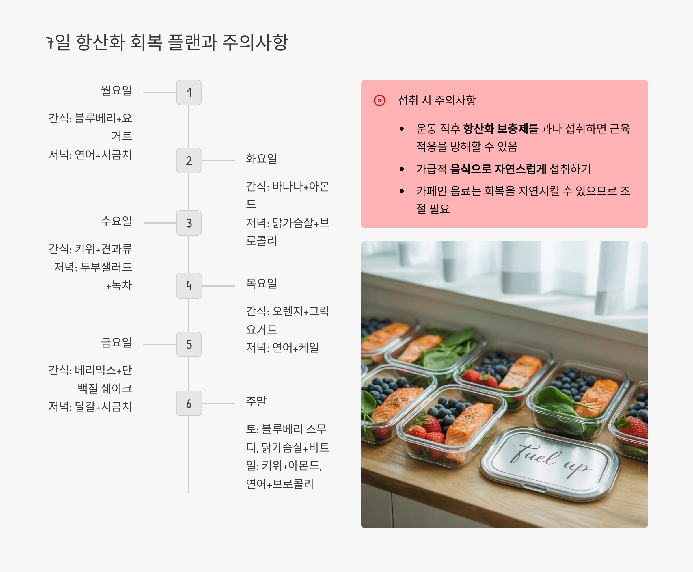 저는 운동 후 항산화 식품을 의도적으로 챙겨 먹으면서 근육통이 줄고 회복 속도가 확실히 빨라졌습니다.