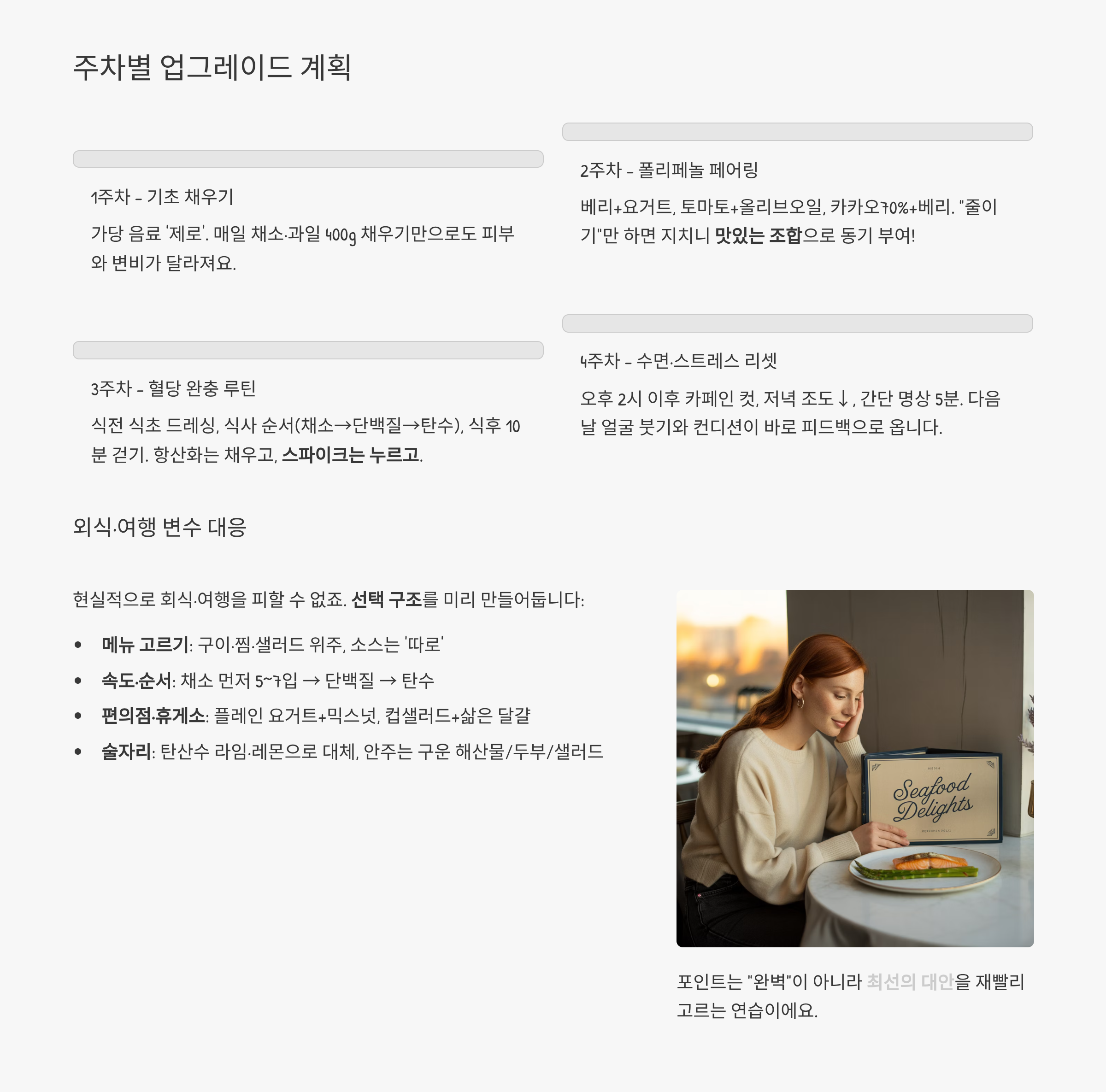 - 메뉴 고르기: 구이·찜·샐러드 위주, 소스는 ‘따로’. 흰빵·감자튀김 대신 샐러드·구운 채소.